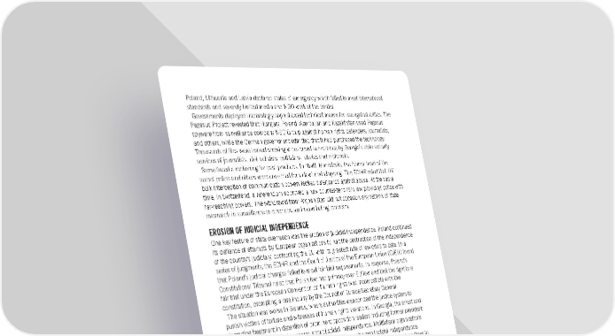 Poland, Lithuania and Latvia declared states of emergency which failed to meet international standards and severely limited media and NGO work at the border. Governments deployed increasingly sophisticated technical means for use against critics. The Pegasus Project revealed that Hungary, Poland, Azerbaijan and Kazakhstan used Pegasus spyware from surveillance company NSO Group against human rights defenders, journalists, and others, while the German government admitted that it had purchased the technology. Thousands of files were leaked showing widespread surveillance by Georgia’s state security services of journalists, civil activists, politicians, clerics and diplomats. Some faced a reckoning for past practices. In North Macedonia, the former head of the secret police and others were convicted for unlawful wiretapping. The ECtHR ruled that UK bulk interception of communication powers lacked safeguards against abuse. At the same time, in Switzerland, a referendum approved a new counter-terrorism law providing police with far-reaching powers. The withdrawal from Afghanistan did not occasion any rethink of state overreach in surveillance or other abuses in combating terrorism. EROSION OF JUDICIAL INDEPENDENCE One key feature of state overreach was the erosion of judicial independence. Poland continued its defiance of attempts by European organizations to halt the destruction of the independence of the country’s judiciary, confronting the EU with its greatest rule of law crisis to date. In a series of judgments, the ECtHR and the Court of Justice of the European Union (CJEU) found that Poland’s judicial changes failed to meet fair trial requirements. In response, Poland’s Constitutional Tribunal ruled that Polish law had primacy over EU law and that the right to a fair trial under the European Convention on human rights was incompatible with the constitution, prompting a rare inquiry by the Council of Europe Secretary General. The situation was worse in Belarus, where authorities weaponized the justice system to punish victims of torture and witnesses of human rights violations. In Georgia, the arrest and degrading treatment in detention of prominent opposition leaders including former president Mikheil Saakashvili raised concerns about judicial independence. Multilateral organizations noted that a new constitution in Kyrgyzstan could encroach upon judicial independence. Turkey took only cosmetic steps around the judiciary, but failed to address the deep flaws in the system. It resisted pressure to implement key judgments of the ECtHR and faced a rarely used infringement proceeding at the end of the year. FREEDOM OF EXPRESSION, ASSEMBLY AND ASSOCIATION FREEDOM OF EXPRESSION Many governments sought to silence criticism, muzzle civil society organizations that could aggregate grievances, and deter protests on the streets. In some countries the primary dangers to media freedom were smear campaigns, online harassment of journalists, especially women, and threats. In Bosnia and Herzegovina, journalists faced almost 300 defamation suits, mostly from politicians, while the total for Croatia was over 900. In Bulgaria, the Czech Republic and Slovenia, the authorities encroached on public service media. In Poland, women’s and LGBTI rights activists continued to face harassment and criminalization. In Romania, reporters investigating corruption were questioned by law enforcement simply for their journalistic work. In Kosovo, an Austrian energy company dropped intimidatory lawsuits against environmental activists who spoke publicly about the impact of construction of hydropower plants on the country’s rivers. Further to the east, numerous civil society activists and journalists who sought to express dissenting views were criminally prosecuted for legitimate activities, and insulting public Amnesty International Report 2021/22 45