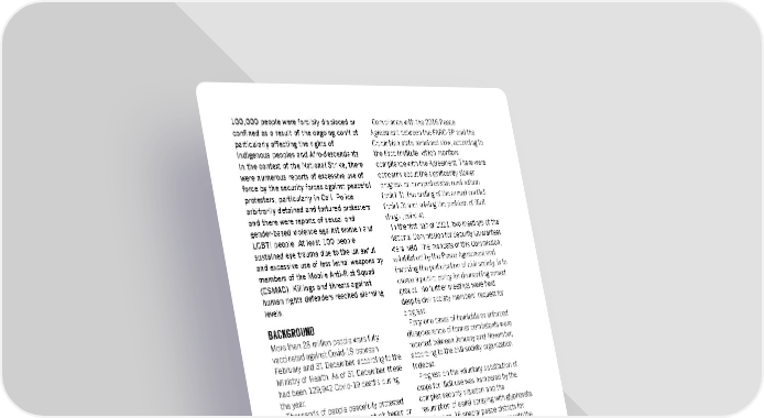 100,000 people were forcibly displaced or Compliance with the 2016 Peace confined as a result of the ongoing conflict, Agreement between the FARC-EP and the particularly affecting the rights of Colombian state remained slow, according to Indigenous peoples and Afro-descendants. the Kroc Institute, which monitors In the context of the National Strike, there compliance with the Agreement. There were were numerous reports of excessive use of concerns about the significantly slower force by the security forces against peaceful progress on comprehensive rural reform protesters, particularly in Cali. Police (point 1), the ending of the armed conflict arbitrarily detained and tortured protesters (point 3) and solving the problem of illicit and there were reports of sexual and drugs (point 4). gender-based violence against women and In the first half of 2021, two meetings of the LGBTI people. At least 100 people National Commission for Security Guarantees sustained eye trauma due to the unlawful were held. The mandate of this Commission, and excessive use of less lethal weapons by established by the Peace Agreement and members of the Mobile Anti-Riot Squad involving the participation of civil society, is to (ESMAD). Killings and threats against create a public policy for dismantling armed human rights defenders reached alarming groups. No further meetings were held levels. despite civil society members’ request for BACKGROUND progress. Forty-one cases of homicide or enforced More than 28 million people were fully disappearance of former combatants were vaccinated against Covid-19 between reported between January and November, February and 31 December, according to the according to the civil society organization Ministry of Health. As of 31 December, there Indepaz. had been 129,942 Covid-19 deaths during Progress on the voluntary substitution of the year. crops for illicit use was hampered by the Thousands of people peacefully protested complex security situation and the as part of the National Strike, which began on resumption of aerial spraying with glyphosate. 28 April. The protests were initially triggered In August, 16 special peace districts for by proposed tax reforms, which the victims were created in compliance with the government sought to impose during a social Peace Agreement. crisis exacerbated by the Covid-19 FREEDOM OF EXPRESSION AND pandemic. The tax proposal was withdrawn ASSEMBLY following pressure from the mass mobilizations. However, the social upheaval According to the Foundation for Press continued and encompassed broader social Freedom (FLIP), illegal profiling was carried demands, calls for justice for human rights out against people who reported police violations, and protests about the slow violence on social media during the National implementation of the 2016 Peace Strike. Military intelligence capabilities were Agreement and the continuing violence in aimed at profiling at least 57 journalists by various regions of the country. collecting data such as geographic location The UN Security Council extended the and social media activity. mandate of the UN Verification Mission in The Ministry of Defence promoted a Colombia to 2022. campaign, “The truth in a sea of lies”, RIGHT TO TRUTH, JUSTICE AND disseminating publications claiming that REPARATION reports of police violence were “false news” and “digital terrorism”. In October, the Constitutional Court extended The FLIP reported 402 attacks on press the Truth and Reconciliation Commission’s workers documenting social demonstrations mandate to 27 June 2022. between April and November; 170 people Amnesty International Report 2021/22 131