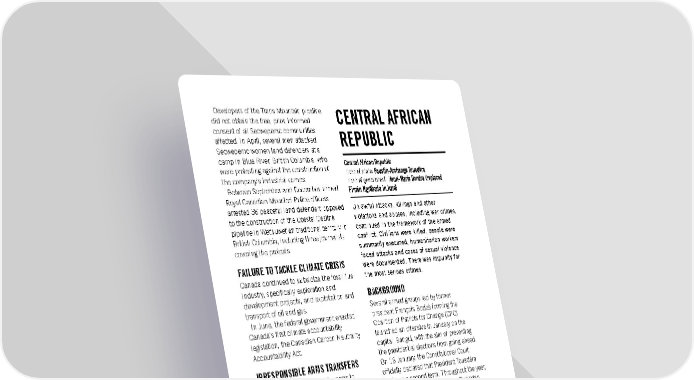 Developers of the Trans Mountain pipeline did not obtain the free, prior, informed CENTRAL AFRICAN consent of all Secwepemc communities affected. In April, several men attacked REPUBLIC Secwepemc women land defenders at a camp in Blue River, British Columbia, who Central African Republic were protesting against the construction of Head of state: Faustin-Archange Touadéra the company's industrial camps. Head of government: Henri-Marie Dondra (replaced Between September and December, armed Firmin Ngrébada in June) Royal Canadian Mounted Police officers arrested 36 peaceful land defenders opposed Unlawful attacks, killings and other to the construction of the Coastal Gaslink violations and abuses, including war crimes, pipeline in Wet’suwet’en traditional territory in continued in the framework of the armed British Columbia, including three journalists conflict. Civilians were killed, people were covering the protests. summarily executed, humanitarian workers FAILURE TO TACKLE CLIMATE CRISIS faced attacks and cases of sexual violence were documented. There was impunity for Canada continued to subsidize the fossil fuel the most serious crimes. industry, specifically exploration and BACKGROUND development projects, and exploitation and transport of oil and gas. Several armed groups led by former In June, the federal government enacted president François Bozizé forming the Canada's first climate accountability Coalition of Patriots for Change (CPC) legislation, the Canadian Carbon Neutrality launched an offensive in January on the Accountability Act. capital, Bangui, with the aim of preventing IRRESPONSIBLE ARMS TRANSFERS the presidential elections from going ahead. On 18 January, the Constitutional Court Canada continued to transfer arms to officially declared that President Touadéra Colombia despite militarized repression of had won a second term. Throughout the year, demonstrations that resulted in human rights national forces and their allies – Rwandan violations. Canada continued to export arms soldiers and mercenaries – led a counter- to Saudi Arabia, despite risk assessments of offensive to retake territories controlled by the transfers that did not conform to the armed groups. According to the OCHA, at the 3 Arms Trade Treaty. end of November there were 670,000 internally displaced people in the country, 1. Canada: Justice for Indigenous Children (Index: AMR 20/4279/2021), with limited access to water, food, healthcare 14 June and education. 2. Canada: I Didn’t Feel Like a Human in There: Immigration Detention UNLAWFUL ATTACKS AND KILLINGS in Canada and its Impact on Mental Health (Index: AMR 20/4195/2021), 17 June Unlawful attacks, killings and other violations 3. “Canada-Saudi arms deal flouts international law: Amnesty and abuses of international humanitarian and International, Project Ploughshares report”, 11 August human rights law, some of which amount to war crimes, were committed by all parties to the conflict. According to the UN, members of the CPC attacked and looted health centres in Mbomou prefecture in January. They also attacked or occupied at least 37 schools from January to June, preventing free access to education for thousands of children. Amnesty International Report 2021/22 118