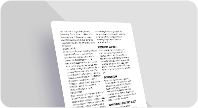 card continued to be generally prevented work rescuing and assisting refugees. The from exiting. The reception conditions in the trial was adjourned and the matter referred to temporary camp of Mavrovouni on Lesvos, a higher court; the investigation into the where the displaced residents of Moria had remaining charges against the group been living since the fires, remained a cause remained pending. for concern. FREEDOM OF ASSEMBLY CHILDREN’S RIGHTS In January, the European Committee of Social Greek authorities failed to facilitate, and Rights found Greece to be in violation of continued to unlawfully interfere with, the several provisions of the European Social right to freedom of peaceful assembly.2 In Charter. The decision focused on the late January, the head of police introduced a inappropriate accommodation provided for blanket ban on public outdoor assemblies of accompanied and unaccompanied migrant more than 100 people citing public health and asylum-seeking children and the failure grounds. Several peaceful assemblies were to ensure their protection from harm. The dispersed by the Greek police throughout the committee also found violations in relation to year. Greece’s guardianship system, the detention DISCRIMINATION of unaccompanied migrant children in “protective custody”, the failure to provide In April, the Racist Violence Recording formal education to children on the Network reported 107 incidents of racist islands and the right to health. violence as recorded in 2020. Between RIGHT TO HEALTH August and October, hate crimes by NGOs campaigning for the opening of access members of far-right groups and other to Covid-19 vaccines for undocumented individuals against migrants, students and people reported persisting challenges. A legal members of political parties were reported in provision adopted in October expanded the Crete, Athens and Thessaloniki. possibilities for undocumented migrants to register for Covid-19 vaccination and obtain CONSCIENTIOUS OBJECTORS’ RIGHTS the relevant certificate, and introduced Serious violations of the rights of safeguards against deportation. In December, conscientious objectors to military service a Ministerial Decision allowed civil society continued, including repeated prosecutions, actors to administer Covid-19 vaccines to fines and arrests. Appeals to the Supreme vulnerable people including those who are Administrative Court against the undocumented. discriminatory rejection of applications for HUMAN RIGHTS DEFENDERS conscientious objector status were pending at the end of the year. The UN Human Rights In March, three UN Special Rapporteurs Committee raised questions over the rights of expressed concerns over new restrictive conscientious objectors – and the punitive registration requirements introduced in 2020 and discriminatory “alternative service” – to for NGOs working with migrants and be considered in the next periodic report of refugees. Greece. Greece also received In November, years after their initial arrest recommendations on the issue in the context and release on bail in 2018, human rights of the UPR. defenders Sarah Mardini and Séan Binder In a landmark ruling in December, the UN together with 22 other members of the NGO Human Rights Committee found multiple Emergency Response Centre International, violations of the ICCPR in the case of faced trial in Lesvos on some of the charges conscientious objector Lazaros Petromelidis. brought against them. These included charges of espionage, unlawful use of radio frequencies and forgery arising from their Amnesty International Report 2021/22 180