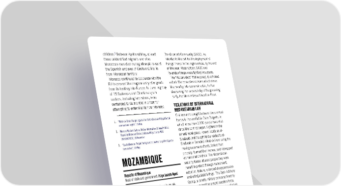 children.3 Between April and May, at least Development Community (SADC), he three unidentified migrants and nine relented to the call for the deployment of Moroccan men died during attempts to reach foreign troops to the region where, by the end the Spanish enclaves of Ceuta and Melilla of the year, Mozambican, SADC and from Moroccan territory. Rwandan troops were fighting insurgents. Morocco continued to cooperate with the The “hidden debt” trial exposed, to a limited EU to prevent the irregular entry of migrants extent, the corruption scheme which drove from its territory into Europe. In June, a group the country into economic crisis, further of 15 Sudanese and Chadian asylum deepening the unpopularity of the governing seekers, including two minors, were party, the Mozambique Liberation Front. sentenced to six months in prison for VIOLATIONS OF INTERNATIONAL attempting to enter Melilla from Morocco. HUMANITARIAN LAW 1. “Morocco: Drop charges against teachers who peacefully protested Civilians were caught between three armed forces in the conflict in Cabo Delgado, in over workers’ rights”, 19 May 2. Morocco/Western Sahara: Further Information: Sahrawi Activist which more than 3,000 people have died Raped by Moroccan Forces: Sultana Khaya (Index: MDE since the conflict began. Fighters in the 29/5058/2021), 30 November armed rebel group, known locally as al- 3. “Spain/Morocco: People ‘being used as pawns’ as political games Shabaab (not thought to be related to al- turn violent”, 19 May Shabaab in Somalia) killed civilians using the most gruesome methods, looted their property, burned their homes, and kidnapped MOZAMBIQUE women and children. The Mozambican security forces abused people they were Republic of Mozambique meant to protect through harassment, Head of state and government: Filipe Jacinto Nyusi extortion, torture, enforced disappearances and extrajudicial killings. The Dyck Advisory The armed group known locally as al- Group, a private military company hired by Shabaab, government security forces and the government as a rapid reaction force, private military operatives continued to fired machine guns and dropped explosives commit war crimes and other serious indiscriminately from helicopters, often failing human rights violations. The authorities to distinguish between civilian and military mishandled the humanitarian crisis in Cabo targets. The death toll continued to rise 1 Delgado, seriously undermining rights to throughout the year. food, water, education, housing and health. INTERNALLY DISPLACED PEOPLE’S Violence against women and girls continued RIGHTS unchecked. Expectant mothers were treated inhumanely, and were beaten, insulted and Nearly 1 million people (primarily women, humiliated in public maternity wards. The children and older people) were internally authorities stifled activity within civic space displaced in the homes of families and through intimidation, harassment and friends and in camps in relatively secure threats against civil society activists and settlements in the south of Cabo Delgado journalists. province, where they lacked adequate access BACKGROUND to food, water, education, health and housing. Food scarcity primarily affected The armed conflict in Cabo Delgado province women and children, putting their health at remained the most critical issue, with risk. The authorities responsible for food aid President Nyusi facing criticism about his distribution demanded sexual favours from mishandling of the conflict. Under mounting displaced women in exchange for pressure from the Southern African registration, documentation and food aid. The Amnesty International Report 2021/22 261