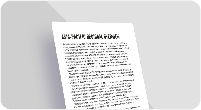 ASIA-PACIFIC REGIONAL OVERVIEW Several countries in the Asia-Pacific region descended into full-blown human rights crisis during the year. In Myanmar, widespread opposition to the military coup in February was met by a ferocious response from the military in which hundreds of people were killed and thousands arbitrarily detained. The Taliban takeover in Afghanistan in August was accompanied by war crimes and the abrupt curtailment of women and girls’ hard won fundamental rights and freedoms. In China, crimes against humanity persisted against Muslims living in Xinjiang, and the human rights situation deteriorated, particularly in Hong Kong. Failures over many years to embed respect for human rights and to hold perpetrators accountable for human rights violations directly contributed to these unfolding human rights catastrophes. Many governments continued to use the Covid-19 pandemic as a pretext for clamping down on rights. New laws were enacted in several countries to criminalize the spreading of “fake” or “false” information about Covid-19, and existing laws used to silence critics and prevent and disperse protests. This reflected a growing intolerance of dissent in the region. Controls on the media and internet tightened in many countries. Political opponents and others who criticized government policies or actions were subjected to increasingly harsh restrictions and punishments. Excessive force was frequently used against peaceful protesters, and governments across the region not only failed to protect the rights of human rights defenders, but actively prevented them from carrying out their vital work. Many governments remained ill-prepared to respond to new surges in Covid-19 infections. Their failure to adequately fund health sectors, tackle corruption, and protect rights at work of health workers resulted in thousands of people being denied adequate access to healthcare and avoidable deaths. Beyond Afghanistan, the situation of women and girls worsened in many countries in the context of the pandemic and related restrictions. In the absence of adequate social support, women working in the informal sector were among those plunged further into poverty. Across the region, women and girls continued to face high-levels of sexual and gender-based violence for which there was little or no accountability. Campaigns were waged against LGBTI people in several countries. Across the region, Indigenous people increasingly suffered the effects of environmental degradation. Tens of thousands of people in Afghanistan and Myanmar were forcibly displaced or sought refuge across borders. However, many were unlawfully returned from neighbouring countries to situations where they were at serious risk of human rights violations. Elsewhere, governments refused entry to asylum seekers and detained and ill-treated refugees and migrants. REPRESSION OF DISSENT The space for dissent narrowed in the Asia-Pacific region. The new military government in Myanmar sought to silence opposition to its coup by violently cracking down on country-wide protests, and arresting members of the former ruling party and pro-democracy activists. In the immediate aftermath of its takeover in Afghanistan, the Taliban curtailed media freedoms and used force to break up protests against its policies. In North Korea, anyone considered to be a threat to the country’s leadership or political system was interned in prison or sentenced to Amnesty International Report 2021/22 35