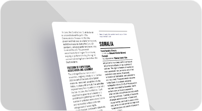In June, the Constitutional Court declared as unconstitutional the parts of the 1. Slovenia: Recognition that sex without consent is rape is a “historic Communicable Diseases Act that the victory for women”, 4 June government had used as a basis for imposing restrictive measures during the Covid-19 SOMALIA pandemic, and gave parliament two months to amend the act. The proposed Federal Republic of Somalia amendments failed to gain the necessary Head of state: Mohamed Abdullahi Mohamed majority in parliament in July, leaving the (Farmaajo) unconstitutional legal provision in force for Head of government: Mohamed Hussein Roble the time being. FREEDOM OF EXPRESSION, All parties to the armed conflict carried out ASSOCIATION AND ASSEMBLY indiscriminate attacks killing hundreds of civilians. The right to freedom of expression The prolonged blanket ban on public was suppressed; two journalists were killed assemblies, originally introduced in October and others were beaten, threatened, 2020 as part of the Covid-19 mitigation harassed and intimidated, and subjected to measures, remained, except for a 12-day arbitrary arrest. The government’s response hiatus, in place until 19 April. The authorities to the Covid-19 pandemic remained imposed heavy fines on protesters who defied inadequate and only 5.1% of the population the ban. In June, the Constitutional Court had been vaccinated by December; health ruled that the government’s decisions to workers were particularly exposed to prohibit public gatherings and limit the infection risks and suffered poor and unsafe number of protesters were unconstitutional working conditions. Hundreds of thousands and represented a disproportionate of people were displaced. In Somaliland, infringement of human rights. the authorities continued to censor critics Media freedom continued to deteriorate, and journalists and carried out large scale with journalists – particularly, female forced evictions and transfer of people in journalists – being the target of frequent Las Anod town. online harassment and threats, including by BACKGROUND the prime minister Janez Janša and other senior politicians. Government officials took Heightened political tensions between federal measures to weaken public media services authorities, regional authorities and by labeling them as “anti-government” or, in opposition leaders rose to new levels, leading case of the Slovenian Press Agency, by to the postponement of presidential and withholding their funding until November. parliamentary elections. Political infighting Slovenia’s ranking in the World Press between Somalia’s president and his prime Freedom Index dropped from 32nd in 2020 minister prevented the implementation of to 36th place. necessary judicial, constitutional and human Government officials also frequently rights reforms. Their public disagreement engaged in smear campaigns against NGOs about the apparent enforced disappearance and other critical voices. The Council of of a woman officer in the National Europe’s Human Rights Commissioner Intelligence and Security Agency (NISA) warned that the toxic and hostile environment threatened to create political divisions for media and civil society organizations had including within the security forces. a chilling effect on freedom of expression and In May, Somaliland held long-delayed human rights work. parliamentary and local council elections for 82 members of the House of Representatives and Councillors in 21 districts. On 5 June, the opposition won 52 of the 82 Amnesty International Report 2021/22 329