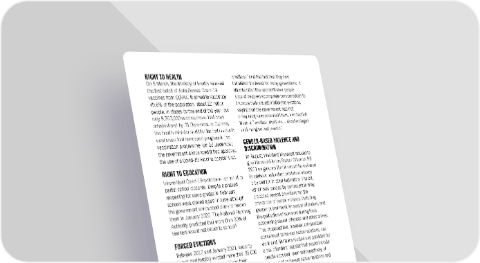 RIGHT TO HEALTH practices” and the fact that they had On 5 March, the Ministry of Health received inhabited the forest for many generations. It the first batch of AstraZeneca Covid-19 directed that the evicted Batwa people vaccines from COVAX. It aimed to vaccinate should be given appropriate compensation to 49.6% of the population, about 22 million improve their situation following evictions, people, in stages by the end of the year, but saying that the government had not only 9,763,030 vaccine doses had been adequately compensated them, and had left administered by 31 December. In October, them a “landless, destitute… disadvantaged the health minister said that limited access to and marginalized people”. rural areas had hampered progress in the GENDER-BASED VIOLENCE AND vaccination programme. On 23 December, DISCRIMINATION the government announced it had approved the use of a Covid-19 vaccine booster shot. In August, President Museveni refused to RIGHT TO EDUCATION give his assent to the Sexual Offences Bill 2021 on grounds that it should be reviewed Intermittent Covid-19 lockdowns led to full or to address redundant provisions already partial school closures. Despite a phased provided for in other legislation. The bill, reopening for some grades in February, which was passed by parliament in May, schools were closed again in June although proposed several provisions for the the government announced plans to reopen prevention of sexual violence, including them in January 2022. The National Planning greater punishment for sexual offenders, and Authority predicted that more than 30% of the protection of survivors during trials learners would not return to school.5 concerning sexual offences and other crimes. FORCED EVICTIONS The proposed law, however, criminalized consensual same-sex sexual relations, sex Between 2017 and January 2021, security work and HIV transmission and provided for forces had forcibly evicted more than 35,000 a sex offenders’ register that would include people (over 2,300 families) from their people accused, even retrospectively, of homes in the western Kiryandongo district, to consensual same-sex sexual relations and make way for industrial farming projects.6 sex work. Between 12 February and the end of the In September, Cleopatra Kambugu year, at least 22 residents were arrested and announced on social media that she had released on bond or bail in connection with become the first trans woman to obtain a protests against evictions and land disputes. Ugandan national identification card and In April, the Minister of Lands, Housing and passport which recognized her female Urban Development ordered two gender. multinational agribusiness companies to halt any further evictions affecting 10,000 REFUGEES’ AND MIGRANTS’ RIGHTS residents from a 5,155-hectare piece of land According to the Office of the Prime Minister in Kiryandongo’s Ndoi village, pending a and UNHCR, the UN refugee agency, decision on whether due process had been Uganda was hosting 1,563,604 refugees at followed. the end of the year, the largest refugee In August, Uganda’s constitutional court population in Africa. These included 953,630 found that the Uganda Wildlife Authority had people from South Sudan, about 61% of the illegally evicted the Batwa Indigenous people country’s refugee population; and 452,287, from their ancestral land in the Mgahinga almost 29%, from the Democratic Republic forest in the south-west. The court ruled that of the Congo; people from other countries, the Batwa people owned the whole or part of including Burundi, Eritrea, Ethiopia, Rwanda, the area on which the forest is located “in Somalia and Sudan made up about 10%. accordance with their customs and/or Amnesty International Report 2021/22 379