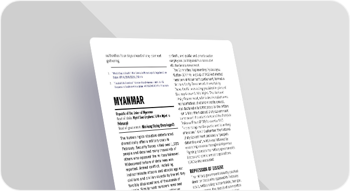 authorities four days ahead of any planned protests, and public and private sector gathering. employees participated in a mass civil disobedience movement. 1. “What I Saw Is Death”: War Crimes in Mozambique’s Forgotten Cape The Committee Representing Pyidaungsu (Index: AFR 41/3545/2021), 2 March Hluttaw (CRPH), a group of NLD-led elected 2. “Treated Like Furniture”: Gender-Based Violence and Covid-19 members of Myanmar’s parliament, formed a Response in Southern Africa (Index: AFR 03/3418/2021), 9 February National Unity Government. It was led by Duwa Lashi La as acting president in place of the imprisoned U Win Myint. The National MYANMAR Unity Government, which also included some representatives of ethnic minority groups, Republic of the Union of Myanmar was declared a terrorist group by the military. Head of state: Myint Swe (replaced U Win Myint in On 5 May, the National Unity Government February) announced the establishment of the People’s Head of government: Min Aung Hlaing (from August) Defence Force (PDF) to counter SAC “violence against the public and its military The human rights situation deteriorated offensives”. On 7 September, the National dramatically after a military coup in Unity Government declared a “people’s February. Security forces killed over 1,000 defensive war”, which was followed by people and detained many thousands of escalating violence throughout Myanmar. others who opposed the military takeover. Fighting between the military government’s Widespread torture of detainees was forces and ethnic armed organizations reported. Armed conflict, including (EAOs) also escalated. indiscriminate attacks and attacks against REPRESSION OF DISSENT civilians and civilian objects by the military, forcibly displaced tens of thousands of The military government violently cracked people. Similar vast numbers remained down on those who opposed its February displaced as result of past conflict or coup, widely using rubber bullets, tear gas, violence. People in areas affected by armed water cannons, live rounds of ammunition conflict lacked basic services, and in some and other lethal force against protesters. areas the military blocked the delivery of According to the NGO Assistance Association humanitarian aid. Women and girls were for Political Prisoners (Burma) (AAPP), as of subjected to sexual violence by the military. 31 December the military government’s Children were denied the right to education. security forces had killed at least 1,384 Dozens of people were sentenced to death people, including 91 children, and arrested by military tribunals in their absence. 11,289. BACKGROUND Those killed included protesters and bystanders. On 10 March, after examining The military staged a coup on 1 February and more than 50 video clips of the ongoing arrested State Counsellor Aung San Suu Kyi crackdown, Amnesty International concluded and President U Win Myint, along with other that the military had used lethal tactics and senior leaders from the ruling National weapons appropriate only for battlefield use League for Democracy (NLD). The military against peaceful protesters in cities and formed the State Administrative Council towns across the country.1 On 2 May, for (SAC) to govern the country led by General example, there were reports of security forces Min Aung Hlaing, who was also appointed as throwing grenades into a crowd of protesters prime minster when the role was re- in northern Kachin State. Soldiers were also established in August. witnessed indiscriminately firing live Following the military takeover, thousands of ammunition in urban areas on multiple people throughout the country took part in occasions. Amnesty International Report 2021/22 263