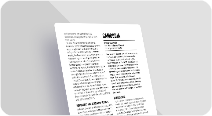 conferences to remember the 1972 massacres, risking pre-empting the TRC’s CAMBODIA conclusions. In July, the President of the National Kingdom of Cambodia Assembly made threatening public remarks Head of state: Norodom Sihamoni about magistrates and undermined the Head of government: Hun Sen independence of the judiciary. The same month, the Governor of Bujumbura province New laws on internet use and in response to proposed regular meetings between the the Covid-19 pandemic further extended judiciary and his office to deliberate on restrictions on civil and political rights. justice-related complaints brought by Contraventions of Covid-19 regulations and residents. In August, President Ndayishimiye criticism of the government were met with spoke out about allegations of corruption arrest and imprisonment. Members of the among judges but took no action to prevent banned opposition party were sentenced to political interference in the justice system. lengthy prison sentences after unfair mass The ICC continued its investigation into the trials. Environmental activists were Burundi situation (despite Burundi’s especially targeted and Indigenous peoples withdrawal from the Rome Statute), with a barred from conservation efforts. Severely focus on “[a]lleged crimes against humanity overcrowded prisons and drug detention committed in Burundi or by nationals of centres undermined the right to health of Burundi outside Burundi since 26 April 2015 detainees. until 26 October 2017”. BACKGROUND REFUGEES’ AND MIGRANTS’ RIGHTS A government crackdown on independent Between January and September, around 36 media, civil society organizations and political Burundians were reported to have arrived in opposition that began in 2017 continued neighbouring countries as asylum seekers. throughout 2021. The largest opposition The numbers leaving Burundi had reduced party, the Cambodia National Rescue Party dramatically from March 2020 because of (CNRP), remained banned following its court- Covid-19 restrictions on movement and some ordered dissolution in 2017. The border restrictions remained in place in government’s anti-drug campaign entered its 2021. fifth year. UNHCR, the UN refugee agency, supported FREEDOM OF EXPRESSION more than 60,000 people in their return to Burundi up to the end of October. In June, On 16 February, Hun Sen signed into law the Burundi’s Conference of Catholic Bishops Sub-Decree on the Establishment of a raised concerns about returnees not being National Internet Gateway which undermined well received in certain areas and being the right to privacy and encouraged self- intimidated by those who were supposed to censorship. The regulation required all support them to reintegrate into society. internet traffic to pass through a centralized oversight body charged with monitoring 1. Burundi: Genuine Reopening of Civic Space Requires Accountability online activity and internet service providers (Index: AFR 16/3806/2021), 11 March to verify the identities of internet users. It also 2. “Burundi: Release of Germain Rukuki a victory for human rights”, 1 allowed for network connections “that affect July; “Burundi: Germain Rukuki’s prison sentence cut from 32 years safety, national revenue, social order, dignity, to one”, 22 June culture, tradition and customs” to be blocked 3. Burundi: Lawyer Gets 5-Year Prison Sentence: Tony Germain Nkina or disconnected. (Index: AFR 16/4636/2021), 20 August Authorities continued to use the Covid-19 pandemic as a pretext to restrict freedom of expression. In early March, Shen Kaidong, a Amnesty International Report 2021/22 111
