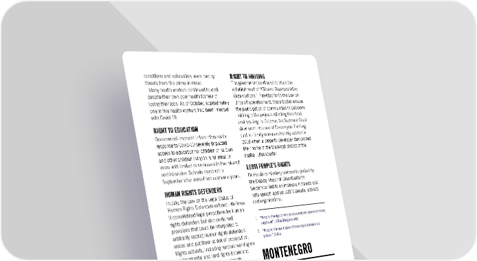 conditions and exhaustion, were met by RIGHT TO HOUSING threats from the prime minister. The government continued to block the Many health workers continued to work establishment of “Citizens’ Representative despite their own poor health for fear of Organisations”. Provided for in the Law on losing their jobs. As of October, approximately Urban Redevelopment, these bodies ensure one in five health workers had been infected the participation of communities in decisions with Covid-19. relating to the projects affecting their land RIGHT TO EDUCATION and housing. In October, the Supreme Court dismissed the case of Davaanyam Puntsag Government-imposed school closures in and his family who were forcibly evicted in response to Covid-19 severely impacted 2018 when a property developer demolished access to education for children of herders their home in the Bayangol district of the and other children living in rural areas or capital, Ulaanbaatar. areas with limited or no access to the internet and television. Schools reopened in LGBTI PEOPLE’S RIGHTS September after almost two academic years. Online discriminatory comments posted by HUMAN RIGHTS DEFENDERS the Deputy Mayor of Ulaanbaatar in September led to an increase in threats and In July, the Law on the Legal Status of hate speech against LGBTI people, activists Human Rights Defenders entered into force. and organizations. It consolidated legal protections for human rights defenders but also contained 1. “Mongolia: The right to freedom of assembly and expression is being provisions that could be interpreted to suppressed”, 12 May (Mongolian only) arbitrarily restrict human rights defenders’ 2. “Mongolia: The real situation of human rights defenders is a voices and put them at risk of prosecution. problem,” 25 May Rights activists, including herders working on environmental and land rights issues and advocates, continued to face threats, MONTENEGRO intimidation and prosecution for their 2 legitimate activities. Republic of Montenegro TORTURE AND OTHER ILL-TREATMENT Head of state: Milo Đukanović Head of government: Zdravko Krivokapić There was no progress towards setting up a national mechanism for the prevention of Impunity persisted for crimes under torture, which was provided for under the international law and attacks on journalists. 2020 revised law on the National Human Misogynist hate speech increased, while Rights Commission of Mongolia, despite ethnic division and religious intolerance Mongolia’s acceptance of relevant deepened. The government failed to deliver recommendations during its UPR. promised reforms. Torture survivors and victims’ families BACKGROUND remained unable to access full and effective reparation. Investigations into allegations of The shaky multi-ethnic coalition government torture were generally flawed and those began to address past violations, including suspected of being responsible were rarely political control of the police, prosecution and brought to justice. According to statistics judiciary, and complicity with organized published by the Prosecutor General’s Office crime. in October, 53 alleged torture cases had been reviewed, but only three resulted in prosecutions. Amnesty International Report 2021/22 256