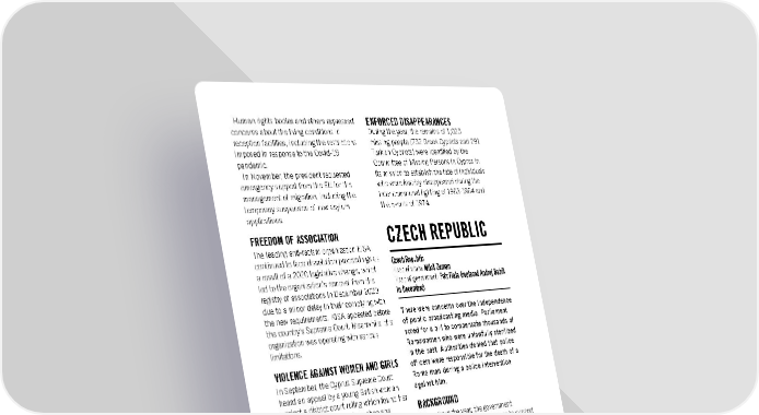 Human rights bodies and others expressed ENFORCED DISAPPEARANCES concerns about the living conditions in During the year, the remains of 1,023 reception facilities, including the restrictions missing people (732 Greek Cypriots and 291 imposed in response to the Covid-19 Turkish Cypriots) were identified by the pandemic. Committee of Missing Persons in Cyprus in In November, the president requested its mission to establish the fate of individuals emergency support from the EU for the who were forcibly disappeared during the management of migration, including the inter-communal fighting of 1963-1964 and temporary suspension of new asylum the events of 1974. applications. FREEDOM OF ASSOCIATION CZECH REPUBLIC The leading anti-racism organization KISA continued to face dissolution proceedings as Czech Republic a result of a 2020 legislative change, which Head of state: Miloš Zeman led to the organization’s removal from the Head of government: Petr Fiala (replaced Andrej Babiš registry of associations in December 2020 in December) due to a minor delay in their complying with the new requirements. KISA appealed before There were concerns over the independence the country’s Supreme Court. Meanwhile, the of public broadcasting media. Parliament organization was operating with serious voted for a bill to compensate thousands of limitations. Romawomen who were unlawfully sterilized VIOLENCE AGAINST WOMEN AND GIRLS in the past. Authorities denied that police officers were responsible for the death of a In September, the Cyprus Supreme Court Roma man during a police intervention heard an appeal by a young British woman against him. against a district court ruling which found her BACKGROUND guilty of making false claims when she reported she was gang-raped in July 2019. Throughout the year, the government Serious concerns existed about the reported adopted socio-economic measures to support shortcomings of the police investigation into individuals affected by the Covid-19 the case and the fairness of her first instance pandemic. They included 14 days’ trial. compensation of wages for those undertaking EXCESSIVE USE OF FORCE compulsory quarantine. In February, police reportedly used unlawful FREEDOM OF ASSEMBLY force against peaceful protesters during an Authorities restricted the right to freedom of anti-corruption demonstration in Nicosia. An peaceful assembly in response to Covid-19. investigation was started by the Independent In December 2020, Parliament announced a Authority for the Investigation of Complaints state of emergency which lasted until 11 against the Police. Although the investigation April. During this period, gatherings were was reportedly completed, the outcome was restricted to a maximum of 500 people. The not known by the end of the year. decision led to protests in January under the FREEDOM OF ASSEMBLY slogan “Let’s open the Czech Republic”. The Cypriot authorities kept in place an FREEDOM OF EXPRESSION unlawful and disproportionate blanket ban on There were concerns over the independence all demonstrations, introduced as part of of public broadcasting media. In March, the Covid-19 related restrictions in March 2020. European Broadcasting Union stated that it had observed increasing politicization of the Amnesty International Report 2021/22 143
