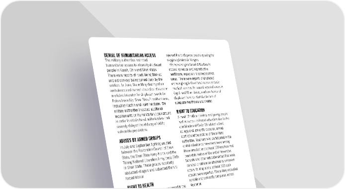 DENIAL OF HUMANITARIAN ACCESS opened fire to disperse people queuing for The military authorities restricted oxygen cylinders in Yangon. humanitarian access to internally displaced Women and girls faced difficulties in people in Kayah, Chin and Shan states. accessing sexual and reproductive There were reports of roads being blocked healthcare, especially in armed conflict and aid convoys being turned back by the areas. There were reports of displaced soldiers. In June, the military destroyed an women giving birth without access to basic ambulance and burned stockpiles of rice and medical services. In several reported cases in medicine intended for displaced people in Kayah and Shan states, newborn babies of Pekon township, Shan State.3 In other areas, displaced families died due to lack of including Kachin and Rakhine states, the adequate healthcare and shelter. military authorities imposed additional RIGHT TO EDUCATION requirements on humanitarian organizations in order to obtain travel authorizations that Almost 12 million children and young people severely delayed the delivery of aid to had no access to formal education due to the vulnerable populations. combination of Covid-19-related school, ABUSES BY ARMED GROUPS college and university closures, armed conflict and the actions of the military In July and September, fighting erupted authorities. Teachers who participated in the between the Restoration Council of Shan civil disobedience movement were among State, the Shan State Army-North, and the those arrested and at least 139 teachers had Ta’ang National Liberation Army, three EAOs been detained as of the end of November. in Shan State. These groups reportedly Schools and other educational facilities were abducted villagers and subjected them to bombed or otherwise attacked by unknown forced labour. actors. In May alone, at least 103 such RIGHT TO HEALTH attacks were reported. The military occupied schools and university campuses across The health system effectively collapsed in the Myanmar. aftermath of the military takeover as health DEATH PENALTY workers joined the civil disobedience movement and a third wave of Covid-19 hit Military courts sentenced dozens of people, the country. Health workers clandestinely including several children, to death after providing medical care, including to injured unfair trials. Many were tried in their protesters, were attacked and arrested by the absence. security forces. According to the WHO, more than 286 attacks on healthcare facilities and 1. “Myanmar: Vast arsenal and notorious troops deployed during personnel took place during the year, nationwide ‘killing spree’ protest crackdown”, 11 March accounting for over one third of attacks on 2. “Myanmar: Unbridled destruction of freedoms as Aung San Suu Kyi healthcare globally. The majority of attacks sentenced”, 6 December were attributed to the military, although bomb 3. “Myanmar: After coup, Myanmar military puts chokehold on people’s attacks by unknown assailants against basic needs”, 17 December military-run hospitals were also reported. At least 26 health workers were killed and 64 injured during the year. NAMIBIA The military government further undermined the Covid-19 response by Republic of Namibia confiscating personal protective equipment Head of state and government: Hage Geingob and already severely limited oxygen supplies in Chin, Kayin and Yangon for use by the Police repeatedly used excessive force. The military. In July security forces reportedly use of prolonged and indefinite pre-trial Amnesty International Report 2021/22 266