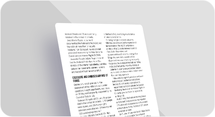 received threats and 20 were arbitrarily protesters in Cali, constituting manifestations detained in the context of protests. of urban paramilitarism. José Alberto Tejada, a journalist Following multiple complaints about the documenting the National Strike in Cali, was militarized response and police repression of the victim of more than 14 security demonstrations, the IACHR undertook a incidents.1 On 31 August, he was granted working visit to Colombia between 8 and 10 provisional measures by the Inter-American June. In its observations and Commission on Human Rights (IACHR). recommendations it called for, among other Journalist Claudia Julieta Duque reported things, the immediate cessation of the that the National Protection Unit of the disproportionate use of force by the security Ministry of the Interior had collected sensitive forces and the removal of the National Police, data on her movements between February including the ESMAD, from the Ministry of and August without her authorization. Defence in order to ensure that their actions EXCESSIVE AND UNNECESSARY USE OF were consistent above all with a civilian rather FORCE than a military approach. Police violence against protesters continued Decree 575, which provided for the during August, September and October, deployment of the military in public order leading 25 civil society organizations to operations in eight departments, was issued request that the IACHR activate the Special on 28 May and temporarily suspended by the Monitoring Mechanism for Human Rights in Council of State in July. Colombia provided for in its report on its Between 28 April and 30 June, 84 people working visit. died in the context of protests; 1,790 people As of 27 May, the National Working Group were injured, and 298 human rights on Enforced Disappearances had reported defenders were attacked. Of those injured, 775 enforced disappearances in the context 103 sustained eye trauma.2 of the National Strike; the fate of 327 people In June, Michelle Bachelet, UN High remained unknown. Commissioner for Human Rights, expressed On 5 June, 17-year-old Duván Felipe Barros her deep concern over reports of serious Gómez disappeared in the context of human rights violations by state security demonstrations in the capital, Bogotá. After a forces in Colombia. In December her office month-long search by his family, his body published a report stating that they had was found in the morgue of the forensic verified 46 deaths (44 civilians and two police facility. officers) in the context of the protests, mainly ARBITRARY DETENTION AND TORTURE in the city of Cali, as well as 60 reports of sexual violence. Of these, the OHCHR According to the NGO Campaign Defending verified 16 cases of sexual violence allegedly Freedom, 3,275 people were arbitrarily committed by members of the National detained in the context of demonstrations Police. between 28 April and 30 June. Cali was the epicentre of the police On 28 May, Álvaro Herrera, Noé Muñoz, 3 repression of social protest. “Operation and Sebastián Mejía were beaten and Siloé”, a joint incursion by members of the detained by armed civilians and National Police, the ESMAD and the Special subsequently detained for 24 hours by the Operations Group (GOES) in which lethal National Police in Cali. Álvaro Herrera and weapons were used against peaceful Sebastián Mejía reported that they were protesters, began on 3 May. Kevin Agudelo subjected to torture and other cruel and was shot during a vigil for victims of police inhuman treatment during their detention. violence and died. On 9 and 28 May, the National Police and armed civilians attacked Amnesty International Report 2021/22 132