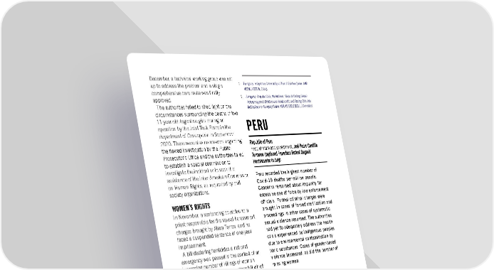 December, a technical working group was set up to address the problem and a single 1. Paraguay: Indigenous Community at Risk of Eviction (Index: AMR comprehensive care route was finally 45/0614/2019), 2 July. approved. 2. Paraguay: They Are Girls, Not Mothers: Steps to Ending Sexual The authorities failed to shed light on the Violence against Children and Adolescents and Forcing Girls into Motherhood in Paraguay (Index: AMR 45/5031/2021), 1 December circumstances surrounding the deaths of two 11-year-old Argentine girls during an operation by the Joint Task Force in the PERU department of Concepción in September 2020. There were also no answers regarding Republic of Peru the flawed investigation by the Public Head of state and government: José Pedro Castillo Prosecutor's Office and the authorities failed Terrones (replaced Francisco Rafael Sagasti to establish a special commission to Hochhausler in July) investigate the incident or to seek the assistance of the Inter-American Commission Peru recorded the highest number of on Human Rights, as requested by civil Covid-19 deaths per million people. society organizations. Concerns remained about impunity for WOMEN´S RIGHTS excessive use of force by law enforcement officials. Formal criminal charges were In November, a sentencing court found a brought in cases of forced sterilization and priest responsible for the sexual harassment proceedings in other cases of systematic charges brought by Alexa Torres, and he sexual violence resumed. The authorities faced a suspended sentence of one year had yet to adequately address the health imprisonment. crisis experienced by Indigenous peoples A bill declaring femicides a national due to environmental contamination by emergency was passed in the context of an toxic substances. Cases of gender-based increasing number of killings of women. violence increased, as did the number of Congress also discussed another bill which missing women. would define cases as family violence even BACKGROUND where the perpetrator and victim are not cohabiting. The Supreme Court of Justice During the first half of the year, presidential approved the protocol for dealing with cases and congressional elections were held. The of domestic violence against women and the campaign was marked by discrimination and Ministry of Public Health and Social Welfare racism towards voters from rural and issued a manual on support services for Indigenous peoples’ communities. victims of domestic violence. EXCESSIVE USE OF FORCE The Public Defender’s Office reported in mid-November that a record 2,312 women Investigations by the Attorney General’s Office had been assisted in the first six months of into the deaths of Inti Sotelo and Bryan the year within the framework of Law 5777. Pintado, two young men killed by police The National Police and Ministry of Women during a protest in November 2020, made SOS helpline registered 4,469 cases of slow progress. Although the government domestic violence in the same period. granted the families economic, health and A bill to prevent, punish and eradicate educational assistance, their right to truth gender-based political violence against and justice had not been fulfilled by the end women was before Congress at the end of the of the year. year. The 2020 Police Protection Law, which includes a presumption in favour of the police about the reasonableness of the use of Amnesty International Report 2021/22 296