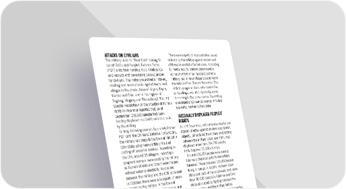 ATTACKS ON CIVILIANS There were reports of rape and other sexual The military used its “Four Cuts” strategy to violence by the military against women and cut off EAOs and People’s Defence Force children in conflict-affected areas. According (PDF) units from funding, food, intelligence to media reports, soldiers gang-raped a and recruits with devastating consequences woman in front of her husband during a for civilians. The military launched air strikes, military raid in Aklui village close to Tedim shelling and arson attacks against towns and township in Chin State in November. The villages in the ethnic states of Kayah, Kayin, victim’s pregnant sister, who lived in the Kachin and Chin, and in the regions of same village, was also reportedly raped. Sagaing, Magway and Thanintharyi. The UN According to the same source, the military Special Rapporteur on the situation of human also raped a 62-year-old woman in Kutkai rights in Myanmar reported that, as of township, northern Shan State. September, 200,000 people had been INTERNALLY DISPLACED PEOPLES’ forcibly displaced in a bid to escape attacks RIGHTS by the military. In May, following assaults by a newly formed As of 9 December, indiscriminate attacks and PDF unit, the Chinland Defence Force (CDF), attacks directed against civilians and civilian the military laid siege to the town of Mindat in objects, primarily by the military, and fighting Chin State using heavy artillery fire and between the military, EAOs and PDFs, had cutting off essential services. According to displaced more than 284,700 people, the UN, around 15 villagers, including a including over 76,000 children. pregnant woman, were used by the military Around 336,000 people were already as human shields and others were trapped internally displaced prior to the military without water or electricity. As clashes takeover. These included 130,000 people between the military and the CDF escalated living in camps in Kachin, northern Shan in October, there were also reports of arson State and parts of the south-east, and more attacks by the military. In the town of than 90,000 people in Rakhine and Chin Thantlang alone, at least 160 houses and states displaced by fighting between the four churches were reportedly destroyed in Arakan Army and the military before late October. hostilities between them ceased in November From May to November, the military 2020. There were concerns about lack of launched retaliatory attacks on villages in humanitarian access to many of the sites in Kayah and Southern Shan states in response which they were living. to attacks by the Karenni Nationalities At least 126,000 Rohingya Muslims Defence Force, a joint PDF and EAO force, remained effectively interned in camps in on police and military facilities in Demoso Rakhine State since violence in 2012. After and Loikaw townships in Kayah State and the coup, local authorities reinstated a Pekon townships in southern Shan State. At directive that further restricted the freedom of least 55 civilians were killed and churches movement of Rohingya communities living in reportedly destroyed during successive northern Rakhine. These communities military attacks in these areas. continued to have very limited access to In December, reports of the killing by the basic services, including healthcare and military of at least 35 civilians in eastern education. The rapidly deteriorating human Kayah State, including four children and two rights situation in Myanmar failed to provide humanitarian workers from Save the an enabling environment for voluntary Children, prompted condemnation by the UN repatriations of Rohingya refugees in Security Council and renewed calls for a Bangladesh who fled atrocities in Rakhine global arms embargo on the Myanmar State in 2016 and 2017. military government. Amnesty International Report 2021/22 265