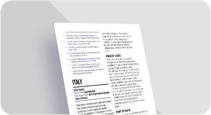 and private workplaces. The measure 1. “Massive data leak reveals Israeli NSO Group’s spyware used to sparked demonstrations in some cities. In target activists, journalists, and political leaders globally”, 18 July Rome, protests turned violent when 2. “Israel/OPT: Pattern of Israeli attacks on residential homes in Gaza hundreds of people led by the leaders of a must be investigated as war crimes”, 17 May far-right party ransacked the national 3. “Israel/OPT: Scrap plans to forcibly evict Palestinian families in headquarters of the main left-wing trade Silwan”, 25 May 4. “Israeli police targeted Palestinians with discriminatory arrests, union. torture and unlawful force”, 24 June 5. “Israel/OPT: ‘Chilling repercussions’ of travel ban on Amnesty WORKERS’ RIGHTS Health and care workers who raised campaigner must be a wake-up call for all”, 6 April 6. “Israel/OPT: Designation of Palestinian civil society groups as concerns about poor and unsafe working conditions in care homes during the Covid-19 terrorists a brazen attack on human rights”, 22 October 7. “Devices of Palestinian human rights defenders hacked with NSO pandemic were subjected to unfair Group’s Pegasus spyware”, 8 November disciplinary proceedings and feared reprisals from their employers. Instead of addressing their concerns over the use of PPE and the ITALY true number of Covid-19 cases in care homes, employers used unfair dismissals and 1 Italian Republic anti-union measures to silence them. Head of state: Sergio Mattarella In May, an employment tribunal in Milan Head of government: Mario Draghi (replaced Giuseppe ruled as unfair the dismissal of an outsourced Conte in February) worker who had reported health and safety violations in March 2020 in a private care Employers silenced health and care workers home. The court acknowledged his who raised concerns about working revelations were of public interest to prevent conditions in care homes during the deaths. Covid-19 pandemic. Older people in care RIGHT TO HEALTH homes were denied meaningful contact with the outside world. Violence against women The rights of care homes’ older residents to a persisted and obstacles to accessing private and family life continued to be abortion were not addressed. Parliament violated, with prolonged isolation causing a failed to extend protection against hate deterioration in residents’ physical and crimes to people attacked because of their mental health. Although visits by family gender, gender identity or sexual members holding a Covid-19 certificate were orientation. Migrants with an irregular allowed to resume in May, and the so-called status remained vulnerable to exploitation “green pass” legislation in September and abuses. Cooperation with Libya on recognized the right to daily visits, many migration continued, despite abuses. The private and public care homes continued to authorities continued to criminalize deny older people meaningful contacts with solidarity with refugees and migrants at the outside world. borders. Torture remained a concern. A commission of inquiry on the authorities’ BACKGROUND response to Covid-19 in care homes had not been established by the end of the year. In July, the government extended the state of VIOLENCE AGAINST WOMEN AND GIRLS emergency to combat the Covid-19 pandemic until the end of the year. In Levels of violence against women remained September, it also made it obligatory to have high. A total of 102 women were killed in a “Covid-19 green pass” showing proof of domestic violence incidents, 70 of whom by vaccination, recovery from Covid-19 or a partners or ex-partners. In December, the negative test result in order to access public government approved a bill to strengthen Amnesty International Report 2021/22 211