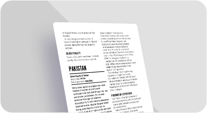 All Migrant Workers and Members of Their “green Eurobond” to finance dam Families. construction. However, the country’s most In June, the government extended its climate-vulnerable populations did not seem Covid-19 vaccination campaign to migrant to benefit from these measures, and workers; before this they had to pay for assistance to cope with extreme weather vaccines. remained elusive. Pakistan fulfilled its DEATH PENALTY commitment to submit its updated and enhanced National Determined Contributions Courts continued to hand down the death ahead of the 26th Conference of the Parties penalty. No executions were reported. (COP26), stating the intention to cut Pakistan’s carbon emissions by 50% by 2030. While a welcome development, no civil PAKISTAN society groups were consulted in the decision-making process. Islamic Republic of Pakistan The unfolding crisis in neighbouring Head of state: Arif Alvi Afghanistan brought new security Head of government: Imran Khan implications for Pakistan, with the rise of Taliban-affiliated armed groups in Pakistan. While some legislative progress was made, Pakistan closed its borders to Afghans freedom of expression and dissent travelling without documents following an continued to be restricted through new laws influx of refugees. and harsher punishments. Police used FREEDOM OF EXPRESSION excessive force against protesters. Accountability for enforced disappearances Restrictions on the right to freedom of remained elusive, despite the government expression intensified, with journalists and taking some steps to criminalize the human rights defenders coming under practice. A series of highly publicized cases increased scrutiny. highlighted the ongoing problem of violence Retired Professor Muhammad Ismail was against women. Thousands of people were detained in February, following the made homeless following forced evictions. cancellation of his bail. He was targeted by BACKGROUND the authorities in connection with his daughter’s human rights advocacy. Despite The Senate unanimously passed the his ill health, hearings to grant him bail were Prevention of Torture and Custodial Death repeatedly delayed until he was released in Bill, an overdue but encouraging step for the April. campaign to criminalize torture. The Journalist Absar Alam was shot and injured Supreme Court banned the death penalty for outside his home in April. Although the prisoners with mental health disabilities. government was quick to denounce the There remained a strong emphasis on attack, the investigation remained ongoing at tackling climate change, with Pakistan the end of the year. hosting the 2021 virtual World Environment In May, three men, at least one of whom Day. Prime Minister Khan continued to was armed, broke into the home of journalist prioritize climate change mitigation both Asad Toor and physically attacked him. Days domestically and in foreign policy, and the after the attack, he was summoned for development of a National Adaptation Plan questioning by the Federal Investigation was announced. Other existing adaptation Agency for “defaming” Pakistan. Journalist and mitigation measures continued, Hamid Mir was taken off the air by his including a mass tree planting drive, broadcaster – allegedly because of pressure protection of wetlands, expanding mangrove from the state – after he called for forest cover, an electric vehicle policy and a accountability for Asad Toor’s attack. The Amnesty International Report 2021/22 286