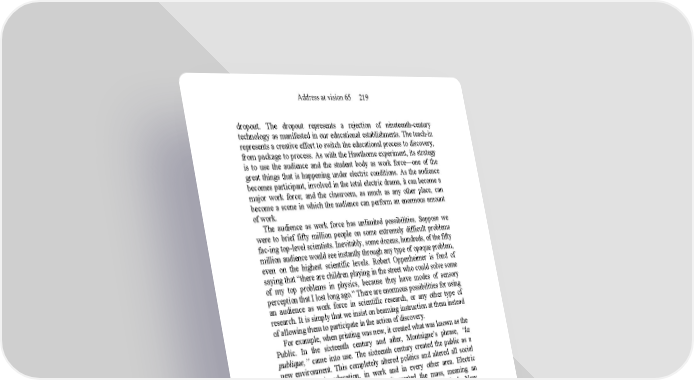 Address at vision 65 219 dropout. The dropout represents a rejection of nineteenth-century technology as manifested in our educational establishments. The teach-in represents a creative effort to switch the educational process to discovery, from package to process. As with the Hawthorne experiment, its strategy is to use the audience and the student body as work force—one of the great things that is happening under electric conditions. As the audience becomes participant, involved in the total electric drama, it can become a major work force; and the classroom, as much as any other place, can become a scene in which the audience can perform an enormous amount of work. The audience as work force has unlimited possibilities. Suppose we were to brief fifty million people on some extremely difficult problems fac-ing top-level scientists. Inevitably, some dozens, hundreds, of the fifty million audience would see instantly through any type of opaque problem, even on the highest scientific levels. Robert Oppenheimer is fond of saying that “there are children playing in the street who could solve some of my top problems in physics, because they have modes of sensory perception that I lost long ago.” There are enormous possibilities for using an audience as work force in scientific research, or any other type of research. It is simply that we insist on beaming instruction at them instead of allowing them to participate in the action of discovery. For example, when printing was new, it created what was known as the Public. In the sixteenth century and after, Montaigne’s phrase, “la publique,” came into use. The sixteenth century created the public as a new environment. This completely altered politics and altered all social arrangements in education, in work and in every other area. Electric circuitry did not create the public, it created the mass, meaning an environment of information that involved everybody in everybody. Now, to a man brought up in the environment of the public, the mass audience is a horror—it is a mess. In the same way, the public was a many-headed monster to a feudal aristocrat. He never bothered to study its structure any more than we study the mass. Circuitry brings people into relation with each other in total involvement which creates the possibility of dialogue and discovery on an enormous scale. The structure of the public had less of such possibility. The public consisted of fragmented separate individuals with separate points of view. The public was an additive structure. The mass audience is a quite different structure, enormously richer—enormously more capable of integrated creative activity than the old public was. All the old public could do was to enunciate private points of view which they clashed into each other furiously. At the present moment in Canada, if you want a DEW line warning, we are having an election in which no one is interested. There is no involvement because the old political forms do not permit participation. You simply register a fragmented, unrelated-to-anything vote. The population has dropped out of the political setup. Yet when these changing structures are studied they yield enormous meaning.
