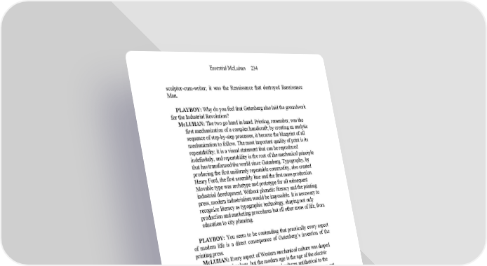 Essential McLuhan 234 sculptor-cum-writer; it was the Renaissance that destroyed Renaissance Man. PLAYBOY: Why do you feel that Gutenberg also laid the groundwork for the Industrial Revolution? McLUHAN: The two go hand in hand. Printing, remember, was the first mechanization of a complex handicraft; by creating an analytic sequence of step-by-step processes, it became the blueprint of all mechanization to follow. The most important quality of print is its repeatability; it is a visual statement that can be reproduced indefinitely, and repeatability is the root of the mechanical principle that has transformed the world since Gutenberg. Typography, by producing the first uniformly repeatable commodity, also created Henry Ford, the first assembly line and the first mass production. Movable type was archetype and prototype for all subsequent industrial development. Without phonetic literacy and the printing press, modern industrialism would be impossible. It is necessary to recognize literacy as typographic technology, shaping not only production and marketing procedures but all other areas of life, from education to city planning. PLAYBOY: You seem to be contending that practically every aspect of modern life is a direct consequence of Gutenberg’s invention of the printing press. McLUHAN: Every aspect of Western mechanical culture was shaped by print technology, but the modern age is the age of the electric media, which forge environments and cultures antithetical to the mechanical consumer society derived from print. Print tore man out of his traditional cultural matrix while showing him how to pile individual upon individual into a massive agglomeration of national and industrial power, and the typographic trance of the West has endured until today, when the electronic media are at last demesmerizing us. The Gutenberg Galaxy is being eclipsed by the constellation of Marconi. PLAYBOY: You’ve discussed that constellation in general terms, but what precisely are the electric media that you contend have supplanted the old mechanical technology? McLUHAN: The electric media are the telegraph, radio, films, telephone, computer and television, all of which have not only extended a single sense of function as the old mechanical media did—i.e., the wheel as an extension of the foot, clothing as an extension of the skin, the phonetic alphabet as an extension of the eye—but have enhanced and externalized our entire central nervous systems, thus transforming all aspects of our social and psychic existence. The use of the electronic media constitutes a break