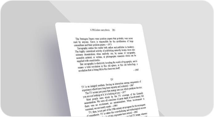 A McLuhan sourcebook 283 The Pentagon Papers were position papers that probably were never read by anyone. Xerox is responsible for the proliferation of large committees and their position papers.—1973 Xerography makes the reader both author and publisher in tendency. The highly centralized activity of publishing naturally breaks down into extreme decentralism when anybody can, by means of xerography, assemble printed, or written, or photographic materials which can be supplied with sound tracks. But xerography is electricity invading the world of typography, and it means a total revolution in this old sphere, or this old technology, a revolution that is being felt in the classroom itself. —1965 TV TV is an integral medium, forcing an interaction among components of experience which have long been separate and scattered.—1967 The TV screen just pours that energy into you which paralyses the eye; you are not looking at it; it is looking at you.—1977 Most people were struck by the TV coverage of the Kennedy assassination. We were all conscious of great depth of involvement, but there was no excitement, no sensationalism. When involvement is maximal, we are nearly numb.—1964 TV, then, is not part of the 19th-century art-program for the reconquest of synesthesia. TV is rather the overwhelming and technological success of that program after its artistic exponents have retired.—1961 The man with a very private face makes a very bad TV image, whereas somebody that looks like an old peasant, or a very broken-down character, makes good TV.—1972 If television is going to strip us of our civilized individuality, of our separate selves, then we should close down TV. Because, as far as I know, television is incompatible with the continuance of Western man.—1972 For centuries Americans had gone outside to be alone and had gone inside to be warm and sociable. The basic pattern had reversed the custom of the rest of mankind. Suddenly, TV had brought Americans into line with Europe and Asia. Since TV, the young, at least, tend to go outside to be with people and inside to be alone.—1973 Why should the broken line of the television mosaic emphasize the sculptural contours of objects? —1960 The TV image is the first technology to project or externalize our tactile sense.—1967 In the movie you sit and look at the screen. You are the camera eye. In television you are the screen. You are the vanishing point as in an oriental picture. The picture goes inside you. In the movie, you go outside into the world. In television you go inside yourself.—1967