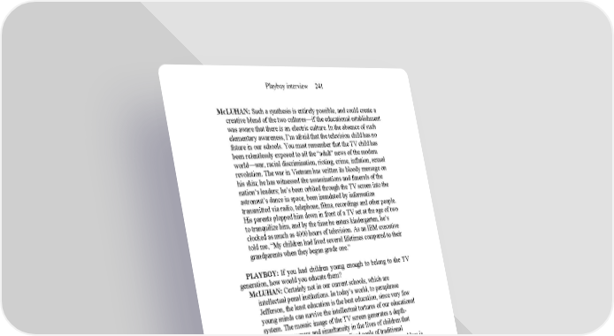 Playboy interview 241 McLUHAN: Such a synthesis is entirely possible, and could create a creative blend of the two cultures—if the educational establishment was aware that there is an electric culture. In the absence of such elementary awareness, I’m afraid that the television child has no future in our schools. You must remember that the TV child has been relentlessly exposed to all the “adult” news of the modern world—war, racial discrimination, rioting, crime, inflation, sexual revolution. The war in Vietnam has written its bloody message on his skin; he has witnessed the assassinations and funerals of the nation’s leaders; he’s been orbited through the TV screen into the astronaut’s dance in space, been inundated by information transmitted via radio, telephone, films, recordings and other people. His parents plopped him down in front of a TV set at the age of two to tranquilize him, and by the time he enters kindergarten, he’s clocked as much as 4000 hours of television. As an IBM executive told me, “My children had lived several lifetimes compared to their grandparents when they began grade one.” PLAYBOY: If you had children young enough to belong to the TV generation, how would you educate them? McLUHAN: Certainly not in our current schools, which are intellectual penal institutions. In today’s world, to paraphrase Jefferson, the least education is the best education, since very few young minds can survive the intellectual tortures of our educational system. The mosaic image of the TV screen generates a depth- involving nowness and simultaneity in the lives of children that makes them scorn the distant visualized goals of traditional education as unreal, irrelevant and puerile. Another basic problem is that in our schools there is simply too much to learn by the traditional analytic methods; this is an age of information overload. The only way to make the schools other than prisons without bars is to start fresh with new techniques and values. PLAYBOY: A number of experimental projects are bringing both TV and computers directly into the classrooms. Do you consider this sort of electronic educational aid a step in the right direction? McLUHAN: It’s not really too important if there is ever a TV set in each classroom across the country, since the sensory and attitudinal revolution has already taken place at home before the child ever reaches school, altering his sensory existence and his mental processes in profound ways. Book learning is no longer sufficient in any subject; the children all say now, “Let’s talk Spanish,” or “Let the Bard be heard,” reflecting their rejection of the old sterile system where education begins and ends in a book. What we need now is educational crash programing in depth to first understand and then meet the new challenges. Just putting the present