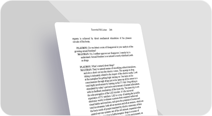 Essential McLuhan 244 orgasm is achieved by direct mechanical stimulation of the pleasure circuits of the brain. PLAYBOY: Do we detect a note of disapproval in your analysis of the growing sexual freedom? McLUHAN: No, I neither approve nor disapprove. I merely try to understand. Sexual freedom is as natural to newly tribalized youth as drugs. PLAYBOY: What’s natural about drugs? McLUHAN: They’re natural means of smoothing cultural transitions, and also a short cut into the electric vortex. The upsurge in drug taking is intimately related to the impact of the electric media. Look at the metaphor for getting high: turning on. One turns on his consciousness through drugs just as he opens up all his senses to a total depth involvement by turning on the TV dial. Drug taking is stimulated by today’s pervasive environment of instant information, with its feedback mechanism of the inner trip. The inner trip is not the sole prerogative of the LSD traveler; it’s the universal experience of TV watchers. LSD is a way of miming the invisible electronic world; it releases a person from acquired verbal and visual habits and reactions, and gives the potential of instant and total involvement, both all-at-onceness and all-at-oneness, which are the basic needs of people translated by electric extensions of their central nervous systems out of the old rational, sequential value system. The attraction to hallucinogenic drugs is a means of achieving empathy with our penetrating electric environment, an environment that in itself is a drugless inner trip. Drug taking is also a means of expressing rejection of the obsolescent mechanical world and values. And drugs often stimulate a fresh interest in artistic expression, which is primarily of the audile-tactile world. The hallucinogenic drugs, as chemical simulations of our electric environment, thus revive senses long atrophied by the overwhelmingly visual orientation of the mechanical culture. LSD and related hallucinogenic drugs, furthermore, breed a highly tribal and communally oriented subculture, so it’s understandable why the retribalized young take to drugs like a duck to water. PLAYBOY: A Columbia coed was recently quoted in Newsweek as equating you and LSD. “LSD doesn’t mean anything until you consume it,” she said. “Likewise McLuhan.” Do you see any similarities? McLUHAN: I’m flattered to hear my work described as hallucinogenic, but I suspect that some of my academic critics find me a bad trip. PLAYBOY: Have you ever taken LSD yourself?
