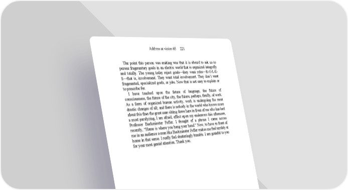 Address at vision 65 221 The point this person was making was that it is absurd to ask us to pursue fragmentary goals in an electric world that is organized integrally and totally. The young today reject goals—they want roles—R-O-L-E- S—that is, involvement. They want total involvement. They don’t want fragmented, specialized goals, or jobs. Now that is not easy to explain or to prescribe for. I have touched upon the future of language, the future of consciousness, the future of the city, the future, perhaps, finally, of work. As a form of organized human activity, work is undergoing the most drastic changes of all; and there is nobody in the world who knows more about this than the great man sitting down here in front of me who has had a most paralyzing, I am afraid, effect upon my endeavors this afternoon, Professor Buckminster Fuller. I thought of a phrase I came across recently, “Home is where you hang your head.” Now, to have in front of me in an audience a man like Buckminster Fuller makes me feel terribly at home in that sense. I really feel shatteringly humble. I am grateful to you for your most genial attention. Thank you.