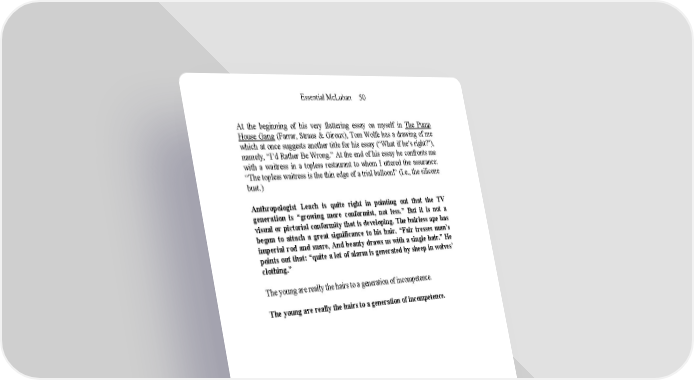 Essential McLuhan 50 At the beginning of his very flattering essay on myself in The Pump House Gang (Farrar, Straus & Giroux), Tom Wolfe has a drawing of me which at once suggests another title for his essay (“What if he’s right?”), namely, “I’d Rather Be Wrong.” At the end of his essay he confronts me with a waitress in a topless restaurant to whom I uttered the assurance: “The topless waitress is the thin edge of a trial balloonl” (I.e., the silicone bust.) Anthropologist Leach is quite right in pointing out that the TV generation is “growing more conformist, not less.” But it is not a visual or pictorial conformity that is developing. The hairless ape has begun to attach a great significance to his hair. “Fair tresses man’s imperial rod and snare, And beauty draws us with a single hair.” He points out that: “quite a lot of alarm is generated by sheep in wolves’ clothing.” The young are really the hairs to a generation of incompetence. The young are really the hairs to a generation of incompetence.