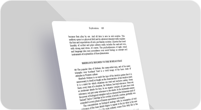 Explorations 189 because they play by ear. And all time is now in oral societies. This auditory space is a physical field and its spherical character really explains the bias and expectations of oral, pre-literate societies. Likewise the visual lineality of scribal and print cultures really includes the anal-oral axis, with strong anal stress, of course. The psychodynamics of sight, sound and language take easy precedence over social biology as concepts and instruments of explanation of these phenomena. SHERLOCK HOLMES VS THE BUREAUCRAT 10 The popular idea of Holmes, the many-sided man, and of his many triumphs over Scotland Yard is a vivid image of the basic clash of attitudes in Western culture. Sherlock Holmes is so much the type of the intuitive genius that it is unnecessary to dwell at length on the characteristics of the intuitive mind. It is a mind for which situations are total and inclusive unities. Every facet, every item of a situation, for Holmes, has total relevance. There are no irrelevant details for him. In an organic complex all parts have total relevance, not just some relevance to the whole. In the nineteenth century the power of biological metaphor such as obsessed the Holmesian mind of Samuel Taylor Coleridge in his scrutiny of artistic creation, gradually was extended to every phase of human speculation and inquiry. The concentration on biological analogy with its assumption of total relevance of the least details begins to appear in the joy taken in the new realism, in documenting the most ordinary scenes from daily life in the press, in the novel, in painting. Flaubert worked in exactly the opposite way from his notion of le mot juste. For Flaubert, every word in a long novel had total relevance to the whole novel not just to the local episode. He was the first to return to contrapuntal composition in which all levels of action and implication are simultaneous and in which character becomes theme or motif. Flaubert like Holmes is an instance of the new artist for whom every art situation is total and inclusive of many of the simultaneous levels which occur in actual experience. THE ARTIST AND THE BUREAUCRAT For the artist with his organic, vivisectional (or living section) point of view of man and society, the natural enemy is the bureaucrat, the man with the tidy desk, the big file, the orderly mind devoid of simultaneous modes of awareness or observation. It needs no documentation to sustain the view that the admirable administrations of Scotland Yard are hostile to the inclusive and instantaneous grasping of situations. The Yard technology is serial, segmented and circumstantial. They conclude effect from immediately preceding cause in lineal and chronological order. They do not dream of totalities or of the major relevance of details.