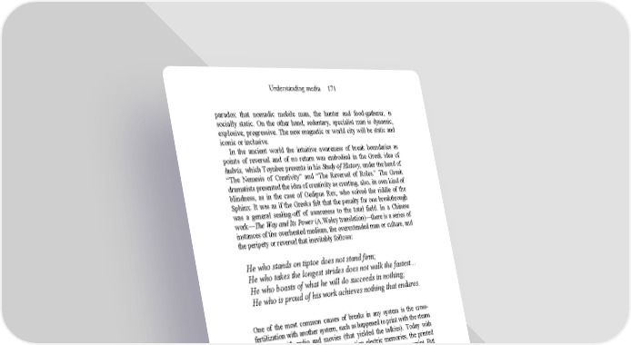 Understanding media 171 paradox that nomadic mobile man, the hunter and food-gatherer, is socially static. On the other hand, sedentary, specialist man is dynamic, explosive, progressive. The new magnetic or world city will be static and iconic or inclusive. In the ancient world the intuitive awareness of break boundaries as points of reversal and of no return was embodied in the Greek idea of hubris, which Toynbee presents in his Study of History, under the head of “The Nemesis of Creativity” and “The Reversal of Roles.” The Greek dramatists presented the idea of creativity as creating, also, its own kind of blindness, as in the case of Oedipus Rex, who solved the riddle of the Sphinx. It was as if the Greeks felt that the penalty for one breakthrough was a general sealing-off of awareness to the total field. In a Chinese work—The Way and Its Power (A.Waley translation)—there is a series of instances of the overheated medium, the overextended man or culture, and the peripety or reversal that inevitably follows: He who stands on tiptoe does not stand firm; He who takes the longest strides does not walk the fastest… He who boasts of what he will do succeeds in nothing; He who is proud of his work achieves nothing that endures. One of the most common causes of breaks in any system is the cross- fertilization with another system, such as happened to print with the steam press, or with radio and movies (that yielded the talkies). Today with microfilm and microcards, not to mention electric memories, the printed word assumes again much of the handicraft character of a manuscript. But printing from movable type was, itself, the major break boundary in the history of phonetic literacy, just as the phonetic alphabet had been the break boundary between tribal and individualist man. The endless reversals or break boundaries passed in the interplay of the structures of bureaucracy and enterprise include the point at which individuals began to be held responsible and accountable for their “private actions.” That was the moment of the collapse of tribal collective authority. Centuries later, when further explosion and expansion had exhausted the powers of private action, corporate enterprise invented the idea of Public Debt, making the individual privately accountable for group action. As the nineteenth century heated up the mechanical and dissociative procedures of technical fragmentation, the entire attention of men turned to the associative and the corporate. In the first great age of the substitution of machine for human toil Carlyle and the Pre-Raphaelites promulgated the doctrine of Work as a mystical social communion, and millionaires like Ruskin and Morris toiled like navvies for esthetic reasons. Marx was an impressionable recipient of these doctrines. Most bizarre of all the reversals in the great Victorian age of mechanization and