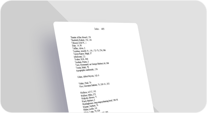Index 405 Theater of the Absurd, 150 Theobald, Robert, 154, 163 Tillyard, E.M.W., 1 Time, 14, 58 Toffler, Alvin, 2 Toynbee, Arnold, 91, 159, 172–73, 276, 386 Trevor-Roper, Hugh, 37 tribal man, 121 Trotter, R.H., 366 Trudeau, Pierre, 2 Tuve, Rosamund, on George Herbert, 60, 306 Twain, Mark, 78 typographic uniformity, 156 Usher, Abbot Payson, 102–3 Valéry, Paul, 70 Vico, Giovanni Battista, 73, 330–31, 332 Wallace, A.F.C, 192 Wallace, Mike, 273 Walpole, Horace, 71 Ward, Barbara, 2 Westinghouse, long range planning brief, 180–81 Wiener, Norbert, 74 White, Leslie, 101 White, Lynn, 79, 326 Whitehead, A.N., 140, 187, 383 Whitman, Walt, 203 Wilson, Edmund, 26 Wilson, Graeme, 319 Wilson, John, 131–34, 136 Wimsatt, W.K., 332–33 Wolfe, Tom, 2, 57, 234 Wolfflin, Heinrich, 136 Woodward, W.H., 315 Wright, Frank Lloyd, 164 Xerography, 227, 277, 279, 293, 348 Yeats, W.B., 5, 61, 109, 113, 163, 170, 178, 265, 268, 320–21, 330–31, 363 Young, J.Z., 100, 102–3, 374