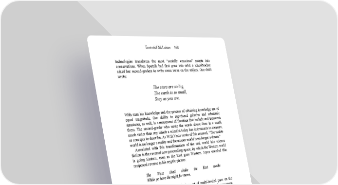 Essential McLuhan 168 technologies transforms the most “socially conscious” people into conservatives. When Sputnik had first gone into orbit a schoolteacher asked her second-graders to write some verse on the subject. One child wrote: The stars are so big, The earth is so small, Stay as you are. With man his knowledge and the process of obtaining knowledge are of equal magnitude. Our ability to apprehend galaxies and subatomic structures, as well, is a movement of faculties that include and transcend them. The second-grader who wrote the words above lives in a world much vaster than any which a scientist today has instruments to measure, or concepts to describe. As W.B.Yeats wrote of this reversal, “The visible world is no longer a reality and the unseen world is no longer a dream.” Associated with this transformation of the real world into science fiction is the reversal now proceeding apace, by which the Western world is going Eastern, even as the East goes Western. Joyce encoded this reciprocal reverse in his cryptic phrase: The West shall shake the East awake While ye have the night for morn. The title of his Finnegans Wake is a set of multi-leveled puns on the reversal by which Western man enters his tribal, or Finn, cycle once more, following the track of the old Finn, but wide awake this time as we re- enter the tribal night. It is like our contemporary consciousness of the Unconscious. The stepping-up of speed from the mechanical to the instant electric form reverses explosion into implosion. In our present electric age the imploding or contracting energies of our world now clash with the old expansionist and traditional patterns of organization. Until recently our institutions and arrangements, social, political, and economic, had shared a one-way pattern. We still think of it as “explosive,” or expansive; and though it no longer obtains, we still talk about the population explosion and the explosion in learning. In fact, it is not the increase of numbers in the world that creates our concern with population. Rather, it is the fact that everybody in the world has to live in the utmost proximity created by our electric involvement in one another’s lives. In education, likewise, it is not the increase in numbers of those seeking to learn that creates the crisis. Our new concern with education follows upon the changeover to an interrelation in knowledge, where before the separate subjects of the curriculum had stood apart from each other. Departmental sovereignties have melted away as rapidly as national sovereignties under conditions of