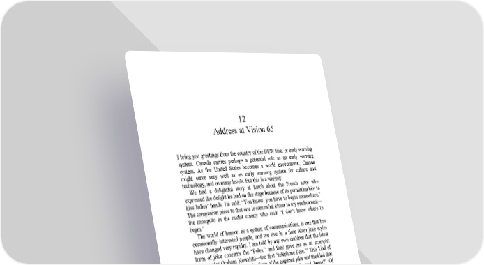 12 Address at Vision 65 I bring you greetings from the country of the DEW line, or early warning system. Canada carries perhaps a potential role as an early warning system. As the United States becomes a world environment, Canada might serve very well as an early warning system for culture and technology, and on many levels. But this is a whimsy. We had a delightful story at lunch about the French actor who expressed the delight he had on the stage because of its permitting him to kiss ladies’ hands. He said: “You know, you have to begin somewhere.” The companion piece to that one is somewhat closer to my predicament— the mosquito in the nudist colony who said: “I don’t know where to begin.” The world of humor, as a system of communications, is one that has occasionally interested people, and we live in a time when joke styles have changed very rapidly. I am told by my own children that the latest form of joke concerns the “Poles,” and they gave me as an example: “Alexander Graham Kowalski—the first ‘telephone Pole.’” This kind of humor is like the slightly older form of the elephant joke and the kind that the computer programmers enjoy—“What is purple and hums?” Of course, the answer is: “An electric grape.” “And, why does it hum?” “It doesn’t know the words.” This kind of joke appeals enormously to youngsters today. If you notice, the tendency in these kinds of jokes, or gags, is for the story line to be stripped off. They tend to be deprived of the old story line, and in its place you have a capsule, a compressed overlay, of stories. In fact, there are usually two stories in these little jokes, simultaneously. The olderfashioned jokes had a straight story line. Steve Allen has a theory that the funnyman is a man with a grievance. In French Canada there are a good many jokes going around these days that are by way of being grievance stories. One of them is this: A mouse being pursued around the house by the house cat finally finds a little spot in the floor to creep in and hide. After a while, everything seems quiet, until suddenly there is a kind of “Arf-Arf-Bow-Wow” noise and the mouse feels the dog must have frightened the cat away, so it pops up and the cat grabs it and chews it down. As he chews the mouse down, he says: “You know, it pays to be bilingual.” That is the old kind of square joke with a story line around it. The new stories tend to be much more compressed and on two levels at once, like the sort of Finnegans Wake phrase: “though he might have been