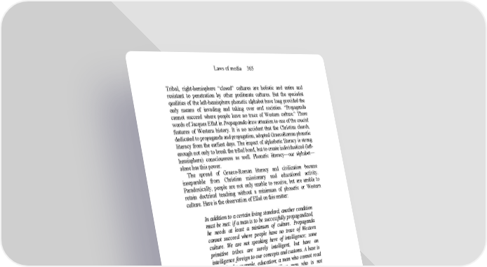Laws of media 365 Tribal, right-hemisphere “closed” cultures are holistic and entire and resistant to penetration by other preliterate cultures. But the specialist qualities of the left-hemisphere phonetic alphabet have long provided the only means of invading and taking over oral societies. “Propaganda cannot succeed where people have no trace of Western culture.” These words of Jacques Ellul in Propaganda draw attention to one of the crucial features of Western history. It is no accident that the Christian church, dedicated to propaganda and propagation, adopted GraecoRoman phonetic literacy from the earliest days. The impact of alphabetic literacy is strong enough not only to break the tribal bond, but to create individualized (left- hemisphere) consciousness as well. Phonetic literacy—our alphabet— alone has this power. The spread of Graeco-Roman literacy and civilization became inseparable from Christian missionary and educational activity. Paradoxically, people are not only unable to receive, but are unable to retain doctrinal teaching without a minimum of phonetic or Western culture. Here is the observation of Ellul on this matter: In addition to a certain living standard, another condition must be met: if a man is to be successfully propagandized, he needs at least a minimum of culture. Propaganda cannot succeed where people have no trace of Western culture. We are not speaking here of intelligence; some primitive tribes are surely intelligent, but have an intelligence foreign to our concepts and customs. A base is needed—for example, education; a man who cannot read will escape propaganda, as will a man who is not interested in reading. People used to think that learning to read evidenced human progress; they still celebrate the decline of illiteracy as a great victory: they condemn countries with a large proportion of illiterates: they think that reading is a road to freedom. All this is debatable, for the important thing is not to be able to read, but to understand what one reads, to reflect on and judge what one reads. Outside of that, reading has no meaning (and even destroys certain automatic qualities of memory and observation). But to talk about critical faculties and discernment is to talk about something far above primary education and to consider a very small minority. The vast majority of people, perhaps 90 percent, know how to read, but they do not exercise their intelligence beyond this. They attribute authority and eminent value to the printed word, or, conversely, reject it altogether. As these people do not possess enough knowledge to reflect and discern, they believe—or disbelieve—in toto what they read. And as such people, moreover, will select the easiest, not the