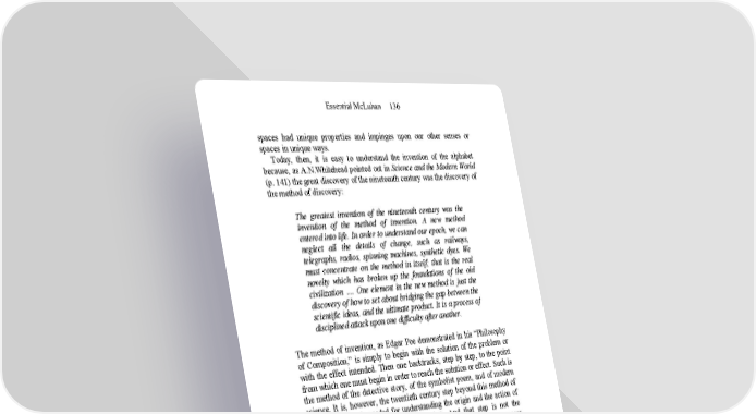 Essential McLuhan 136 spaces had unique properties and impinges upon our other senses or spaces in unique ways. Today, then, it is easy to understand the invention of the alphabet because, as A.N.Whitehead pointed out in Science and the Modern World (p. 141) the great discovery of the nineteenth century was the discovery of the method of discovery: The greatest invention of the nineteenth century was the invention of the method of invention. A new method entered into life. In order to understand our epoch, we can neglect all the details of change, such as railways, telegraphs, radios, spinning machines, synthetic dyes. We must concentrate on the method in itself; that is the real novelty which has broken up the foundations of the old civilization …. One element in the new method is just the discovery of how to set about bridging the gap between the scientific ideas, and the ultimate product. It is a process of disciplined attack upon one difficulty after another. The method of invention, as Edgar Poe demonstrated in his “Philosophy of Composition,” is simply to begin with the solution of the problem or with the effect intended. Then one backtracks, step by step, to the point from which one must begin in order to reach the solution or effect. Such is the method of the detective story, of the symbolist poem, and of modern science. It is, however, the twentieth century step beyond this method of invention which is needed for understanding the origin and the action of such forms as the wheel or the alphabet. And that step is not the backtracking from product to starting point, but the following of process in isolation from product. To follow the contours of process as in psychoanalysis provides the only means of avoiding the product of process, namely neurosis or psychosis. It is the purpose of the present book to study primarily the print phase of alphabetic culture. The print phase, however, has encountered today the new organic and biological modes of the electronic world. That is, it is now interpenetrated at its extreme development of mechanism by the electro-biological, as de Chardin has explained. And it is this reversal of character which makes our age “connatural,” as it were, with non-literate cultures. We have no more difficulty in understanding the native or non- literate experience, simply because we have recreated it electronically within our own culture. (Yet post-literacy is a quite different mode of interdependence from pre-literacy.) So my dwelling upon the earlier phases of alphabetic technology is not irrelevant to an understanding of the Gutenberg era. Colin Cherry had this to say about early writing: