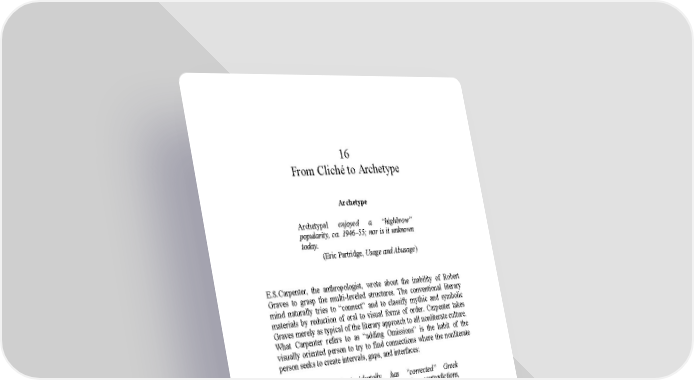 16 From Cliché to Archetype Archetype Archetypal enjoyed a “highbrow” popularity, ca. 1946–55; nor is it unknown today. (Eric Partridge, Usage and Abusage) E.S.Carpenter, the anthropologist, wrote about the inability of Robert Graves to grasp the multi-leveled structures. The conventional literary mind naturally tries to “connect” and to classify mythic and symbolic materials by reduction of oral to visual forms of order. Carpenter takes Graves merely as typical of the literary approach to all nonliterate culture. What Carpenter refers to as “adding Omissions” is the habit of the visually oriented person to try to find connections where the nonliterate person seeks to create intervals, gaps, and interfaces: Graves, not incidentally, has “corrected” Greek mythology in two volumes, eliminating contradictions, adding omissions, arranging lineally, and generally “straightening out.” What I am getting at is that they first turn these myths into what they are not; by arranging symbols they create “content”: then they pigeonhole these various “contents” and come up with archetypes. None of this interests me save the fact that, like Frye, they direct their attention towards a most important problem and, like a hedgehog, build humourless, water-tight systems (with faithful supporters reading “the Book”), that, instead of answering the problem or even illuminating it, block access to it. Graeme Wilson, introducing his translation of the poems of Hagiwara Sakutaro, cites from the 1882 Japanese translations of early-nineteenth- century English poems: The Preface sharply attacked the cramping brevity of traditional forms (“How can a consecutive thought be expressed in such tight forms?”);…