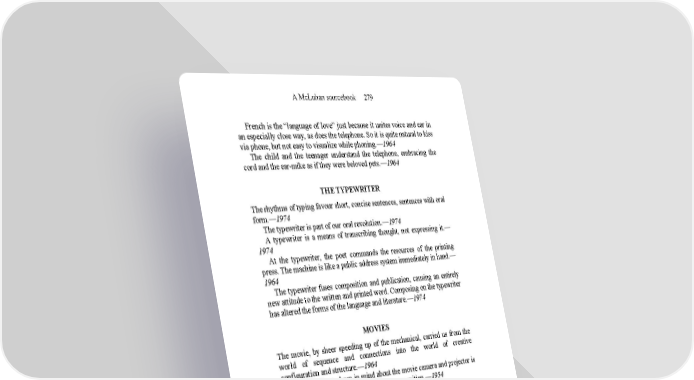 A McLuhan sourcebook 279 French is the “language of love” just because it unites voice and ear in an especially close way, as does the telephone. So it is quite natural to kiss via phone, but not easy to visualize while phoning.—1964 The child and the teenager understand the telephone, embracing the cord and the ear-mike as if they were beloved pets.—1964 THE TYPEWRITER The rhythms of typing favour short, concise sentences, sentences with oral form.—1974 The typewriter is part of our oral revolution.—1974 A typewriter is a means of transcribing thought, not expressing it.— 1974 At the typewriter, the poet commands the resources of the printing press. The machine is like a public address system immediately in hand.— 1964 The typewriter fuses composition and publication, causing an entirely new attitude to the written and printed word. Composing on the typewriter has altered the forms of the language and literature.—1974 MOVIES The movie, by sheer speeding up of the mechanical, carried us from the world of sequence and connections into the world of creative configuration and structure.—1964 The basic fact to keep in mind about the movie camera and projector is their resemblance to the process of human cognition.—1954 Film is still in its Manuscript phase. —1964 When an inexpensive play-back for video tape is available, the film will become as portable as a book after Gutenberg.—1966 Every literary form, from the stream of consciousnessness to James Joyce and Virginia Woolf, to the private eye in the whodunit, is a direct import of film technique. One of the principal effects of new art forms is to awaken older forms to new life and manifestation.—1964 I can only regard the movie as the mechanization and distortion of this cognitive miracle by which we recreate the exterior world. But whereas cognition provides that dance of the intellect which is the analogical sense of Being, the mechanical medium has tended to provide merely a dream world which is a substitute for reality rather than a means of proving reality. —1954 The movie camera is a means of rolling up the daylight world on a spool. It does this by rapid still shots. The movie projector unrolls the spool and recreates the daylight world as a dark dream world. In reversing the process of perception even the mechanical camera and projector bring