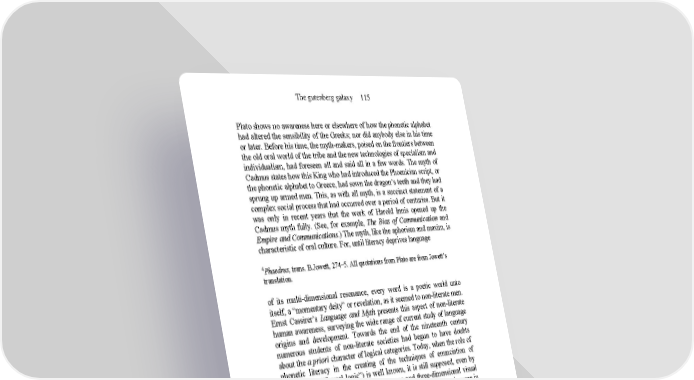 The gutenberg galaxy 115 Plato shows no awareness here or elsewhere of how the phonetic alphabet had altered the sensibility of the Greeks; nor did anybody else in his time or later. Before his time, the myth-makers, poised on the frontiers between the old oral world of the tribe and the new technologies of specialism and individualism, had foreseen all and said all in a few words. The myth of Cadmus states how this King who had introduced the Phoenician script, or the phonetic alphabet to Greece, had sown the dragon’s teeth and they had sprung up armed men. This, as with all myth, is a succinct statement of a complex social process that had occurred over a period of centuries. But it was only in recent years that the work of Harold Innis opened up the Cadmus myth fully. (See, for example, The Bias of Communication and Empire and Communications.) The myth, like the aphorism and maxim, is characteristic of oral culture. For, until literacy deprives language 4 Phaedrus, trans. B.Jowett, 274–5. All quotations from Plato are from Jowett’s translation. of its multi-dimensional resonance, every word is a poetic world unto itself, a “momentary deity” or revelation, as it seemed to non-literate men. Ernst Cassirer’s Language and Myth presents this aspect of non-literate human awareness, surveying the wide range of current study of language origins and development. Towards the end of the nineteenth century numerous students of non-literate societies had begun to have doubts about the a priori character of logical categories. Today, when the role of phonetic literacy in the creating of the techniques of enunciation of propositions (“formal logic”) is well known, it is still supposed, even by some anthropologists, that Euclidean space and three-dimensional visual perception is a universal datum of mankind. The absence of such space in native art is considered by such scholars to be owing to lack of artistic skill. Cassirer, reporting on the notion of words as myth (the etymology of mythos indicates that it means “word”) says (p. 62): According to Usener, the lowest level to which we can trace back the origin of religious concepts is that of “momentary gods”, as he calls those images which are born from the need or the specific feeling of a critical moment…and still bearing the mark of all its pristine volatility and freedom. But it appears that the new findings which ethnology and comparative religion have put at our disposal during the three decades since the publication of Usener’s work enable us to go back one step further yet. Civilization gives the barbarian or tribal man an eye for an ear and is now at odds with the electronic world.