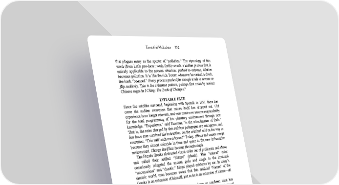 Essential McLuhan 352 that plagues many as the specter of “pollution.” The etymology of this word (from Latin pro-luere: wash forth) reveals a hidden process that is entirely applicable to the present situation: pushed to extreme, dilution becomes pollution. It is like the rich Texan: whenever he cashed a check, the bank “bounced.” Every process pushed far enough tends to reverse or flip suddenly. This is the chiasmus pattern, perhaps first noted by ancient Chinese sages in I Ching: The Book of Changes.* EVITABLE FATE Since the satellite surround, beginning with Sputnik in 1957, there has come the sudden awareness that nature itself has dropped out. Old experience is no longer relevant, and man must now assume responsibility for the total programming of his planetary environment through new knowledge. “Experience,” said Erasmus, “is the schoolmaster of fools.” That is, the rates charged by this ruthless pedagogue are outrageous, and few have ever survived his instruction. As the criminal said on his way to execution: “This will teach me a lesson!” Today, effects and causes merge because they almost coincide in time and space in the new information environment. Change itself has become the main staple. The literate Greeks abstracted visual order out of preliterate oral chaos and called their artifact “Nature” (phusis). This “natural” order consciously relegated the ancient gods and magic to the irrational “unconscious” and “chaotic.” Magic played existence by ear. In today’s electric world, man becomes aware that this artificial “Nature” of the Greeks is an extension of himself, just as he is an extension of nature—all that exists. In this book there is no intent to endorse or condemn what has happened. Our concern is to explore and to reveal the process patterns of current happenings. Since it is no longer safe to wait for the harsh judgment of results, we must discover how to anticipate effects with their causes in order to avoid the “inevitable” by “programming Fate.” * * * The intent of our book is to discuss and illustrate the sudden change from the industrial world of assembly-line “hardware” and visual space into the electric world of orchestrated programming. Twenty-five hundred years of rational culture are in the process of dissolution. Age-old habits of conceptualization will not serve to train observation on the effects of the new man-made forms of energy. Since Plato, philosophers and scientists have attributed constant forms and patterns of action only to the world of “Nature.” Both Plato and Aristotle, *The laws and history of chiastic patterns of action are traced through the Old Testament and classical Greek literature by Nils W.Lund in Chiasmus in the New Testament.