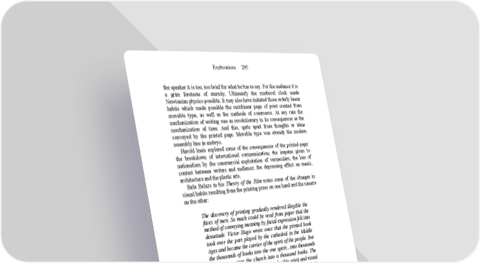 Explorations 295 the speaker it is too, too brief for what he has to say. For the audience it is a grim foretaste of eternity. Ultimately the medieval clock made Newtonian physics possible. It may also have initiated those orderly linear habits which made possible the rectilinear page of print created from movable type, as well as the methods of commerce. At any rate the mechanization of writing was as revolutionary in its consequences as the mechanization of time. And this, quite apart from thoughts or ideas conveyed by the printed page. Movable type was already the modern assembly line in embryo. Harold Innis explored some of the consequences of the printed page: the breakdown of international communication; the impetus given to nationalism by the commercial exploitation of vernaculars; the loss of contact between writers and audience; the depressing effect on music, architecture and the plastic arts. Bela Balazs in his Theory of the Film notes some of the changes in visual habits resulting from the printing press on one hand and the camera on the other: The discovery of printing gradually rendered illegible the faces of men. So much could be read from paper that the method of conveying meaning by facial expression fell into desuetude. Victor Hugo wrote once that the printed book took over the part played by the cathedral in the Middle Ages and became the carrier of the spirit of the people. But the thousands of books tore the one spirit…into thousands of opinions…tore the church into a thousand books. The visual spirit was thus turned into a legible spirit and visual culture into a culture of concepts…. But we paid little attention to the fact that, in conformity with this, the face of individual men, their foreheads, their eyes, their mouths, had also of necessity and quite correctly to suffer a change. At present a new discovery, a new machine is at work to turn the attention of men back to a visual culture and to give them new faces. This machine is the cinematographic camera. Like the printing press it is a technical device for the multiplication and distribution of products of the human spirit; its effect on human culture will not be less than that of the printing press…. The gestures of visual man are not intended to convey concepts which can be expressed in words, but such…non-rational emotions which would still remain unexpressed when everything that can be told has been told…. Just as our musical experiences cannot be expressed in rationalized concepts, what appears on the face and in facial expression is a spiritual experience which is rendered immediately visible without the intermediary of words.