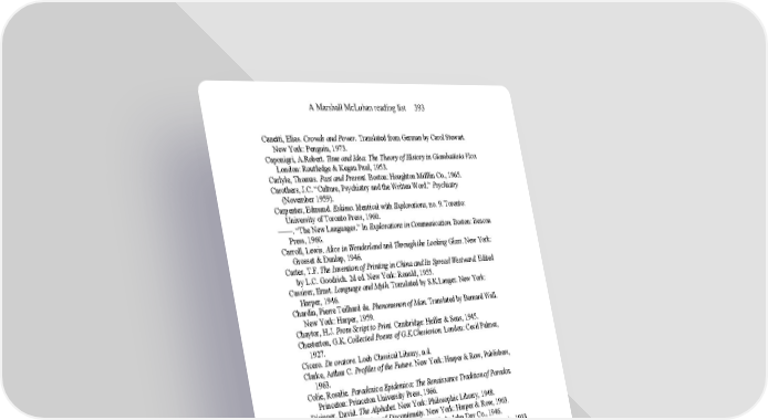 A Marshall McLuhan reading list 393 Canetti, Elias. Crowds and Power. Translated from German by Carol Stewart. New York: Penguin, 1973. Caponigri, A.Robert. Time and Idea: The Theory of History in Giambattista Vico. London: Routledge & Kegan Paul, 1953. Carlyle, Thomas. Past and Present. Boston: Houghton Mifflin Co., 1965. Carothers, J.C. “Culture, Psychiatry and the Written Word.” Psychiatry (November 1959). Carpenter, Edmund. Eskimo. Identical with Explorations, no. 9. Toronto: University of Toronto Press, 1960. ——. “The New Languages.” In Explorations in Communication. Boston: Beacon Press, 1960. Carroll, Lewis. Alice in Wonderland and Through the Looking Glass. New York: Grosset & Dunlap, 1946. Carter, T.F. The Invention of Printing in China and Its Spread Westward. Edited by L.C. Goodrich. 2d ed. New York: Ronald, 1955. Cassirer, Ernst. Language and Myth. Translated by S.K.Langer. New York: Harper, 1946. Chardin, Pierre Teilhard de. Phenomenon of Man. Translated by Bernard Wall. New York: Harper, 1959. Chaytor, H.J. From Script to Print. Cambridge: Heffer & Sons, 1945. Chesterton, G.K. Collected Poems of G.K.Chesterton. London: Cecil Palmer, 1927. Cicero. De oratore. Loeb Classical Library, n.d. Clarke, Arthur C. Profiles of the Future. New York: Harper & Row, Publishers, 1963. Colie, Rosalie. Paradoxica Epidemica: The Renaissance Tradition of Paradox. Princeton: Princeton University Press, 1966. Diringer, David. The Alphabet. New York: Philosophic Library, 1948. Drucker, Peter. The Age of Discontinuity. New York: Harper & Row, 1963. ——. The Concept of the Corporation. New York: John Day Co., 1946. Einstein, Albert. Where Is Science Going? London: George Allen & Unwin, 1933. Eisenstein, Sergei. Film Form. New York: Harcourt Brace & Co., 1949. Eliot, T.S. The Complete Poems and Plays, 1909–1950. New York: Harcourt Brace & Co., 1952. ——. The Sacred Wood: Essays on Poetry and Criticism. London: Methuen & Co., 1948. ——. Selected Essays. New York: Harcourt Brace & Co., 1950. ——. The Use of Poetry and the Use of Criticism. New York: Barnes & Noble, 1955. Eliade, Mircea. The Sacred and the Profane: The Nature of Religion. Translated by W.R. Trask. New York: Harcourt Brace & Co., 1959. Ellul, Jacques. Propaganda: The Foundation of Man’s Attitudes. New York: Alfred A. Knopf, 1965. Erasmus, Desiderius. The Praise of Folly. Princeton: Princeton University Press, 1941. Fenellosa, Ernst. “The Chinese Written Character as a Medium for Poetry.” Translated by Ezra Pound. Washington: Square $ Series, n.d. Frazer, Sir James. The Golden Bough. 3d ed. London: Macmillan, 1951. Friedenberg, Edgar Z. The Vanishing Adolescent. Boston: Beacon Press, 1959. Fries, Charles Carpenter. American English Grammar. New York: Appleton, 1940.