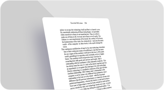 Essential McLuhan 256 unless we escape the technology itself and flee to a hermit’s cave. By consistently embracing all these technologies, we inevitably relate ourselves to them as servomechanisms. Thus, in order to make use of them at all, we must serve them as we do gods. The Eskimo is a servomechanism of his kayak, the cowboy of his horse, the businessman of his clock, the cyberneticist—and soon the entire world—of his computer. In other words, to the spoils belongs the victor. This continuous modification of man by his own technology stimulates him to find continuous means of modifying it; man thus becomes the sex organs of the machine world just as the bee is of the plant world, permitting it to reproduce and constantly evolve to higher forms. The machine world reciprocates man’s devotion by rewarding him with goods and services and bounty. Man’s relationship with his machinery is thus inherently symbiotic. This has always been the case; it’s only in the electric age that man has an opportunity to recognize this marriage to his own technology. Electric technology is a qualitative extension of this age-old man- machine relationship; 20th Century man’s relationship to the computer is not by nature very different from prehistoric man’s relationship to his boat or to his wheel—with the important difference that all previous technologies or extensions of man were partial and fragmentary, whereas the electric is total and inclusive. Now man is begin-ning to wear his brain outside his skull and his nerves outside his skin; new technology breeds new man. A recent cartoon portrayed a little boy telling his nonplused mother: “I’m going to be a computer when I grow up.” Humor is often prophecy. PLAYBOY: If man can’t prevent this transformation of himself by technology—or into technology—how can he control and direct the process of change? McLUHAN: The first and most vital step of all, as I said at the outset, is simply to understand media and their revolutionary effects on all psychic and social values and institutions. Understanding is half the battle. The central purpose of all my work is to convey this message, that by understanding media as they extend man, we gain a measure of control over them. And this is a vital task, because the immediate interface between audile-tactile and visual perception is taking place everywhere around us. No civilian can escape this environmental blitzkrieg, for there is, quite literally, no place to hide. But if we diagnose what is happening to us, we can reduce the ferocity of the winds of change and bring the best elements of the old visual culture, during this transitional period, into peaceful coexistence with the new retribalized society. If we persist, however, in our conventional rearview-mirror approach to these cataclysmic developments, all of Western culture will be