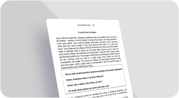 Essential McLuhan 26 From DaVinci to Holmes Joyce’s famous remark that, “though he might have been more humble, there’s no police like Holmes,” contains a world of insight. It includes the modern world and elucidates it at the same instant. Joyce explored popular phraseology and heroes with a precision which this book cannot emulate. In the above phrase which refers to “no place like home,” Joyce diagnoses the collapse of family life and the rise of the police state amidst a welter of sentiment which is partly rosy and partly lethal. Homes are now a part of a police system. Holmes, the homehater and woman-hater, is the hero of the “home-loving” and feminized middle class. The arrogant, sterile Holmes and the happy prolific homes of the late Victorian world are fused in a single image which arrests the mind for contemplation and insight. The passion for Holmes and man-hunting literature (which gives the modern world a major point of correspondence with the symbolic figure of Nimrod and the tower of Babel) goes along Why are both scientist and artist crackpots and pariahs in the popular imagination? Holmes, Renaissance titan or Last of the Mohicans? Watson, wife or mother of the virtuoso of crime? The sleuth cult foreshadows the arrival of the police state? with the commercial passion for exploiting the values of childhood, femininity, and domesticity. On paper there has never been such a cult of the home. In entertainment there has never been such a cult of the sleuth. To provide in a few words a pedigree for the figure of the sleuth who dominates thriller fiction may not be very convincing. The quickest way to get a view of the matter is via Holmes, Kipling, and Darwin. However, Kipling’s Mowgli and Edgar Queeny’s “granitic believer in the law of the jungle,” when taken together, open up interrelations between familiar vistas. In the opening paragraph of Doyle’s A Scandal in Bohemia, Holmes is described as follows: He was, I take it, the most perfect reasoning and observing machine that the world has seen; but, as a lover, he would have placed himself in a false position. He never spoke of the softer passions save with a gibe and a sneer… Grit in a sensitive instrument, or a crack in one of his own high- power lenses, would not be more disturbing than a strong emotion in a nature such as his. Here is the split man of the head-versus-heart, thought-versus-feeling type who appeared in the early seventeenth century. But it was not until Darwin that the head (science) became definitely and consciously antisocial. Mr. Queeny derives his “law of the jungle” versus “crusading idealist” from this later nineteenth-century phase of the older split.