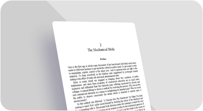 2 The Mechanical Bride Preface Ours is the first age in which many thousands of the best-trained individual minds have made it a full-time business to get inside the collective public mind. To get inside in order to manipulate, exploit, control is the object now. And to generate heat not light is the intention. To keep everybody in the helpless state engendered by prolonged mental rutting is the effect of many ads and much entertainment alike. Since so many minds are engaged in bringing about this condition of public helplessness, and since these programs of commercial education are so much more expensive and influential than the relatively puny offerings sponsored by schools and colleges, it seemed fitting to devise a method for reversing the process. Why not use the new commercial education as a means to enlightening its intended prey? Why not assist the public to observe consciously the drama which is intended to operate upon it unconsciously? As this method was followed, “A Descent Into The Maelstrom” by Edgar Poe kept coming to mind. Poe’s sailor saved himself by studying the action of the whirlpool and by co-operating with it. The present book likewise makes few attempts to attack the very considerable currents and pressures set up around us today by the mechanical agencies of the press, radio, movies, and advertising. It does attempt to set the reader at the center of the revolving picture created by these affairs where he may observe the action that is in progress and in which everybody is involved. From the analysis of that action, it is hoped, many individual strategies may suggest themselves. But it is seldom the business of this book to take account of such strategies. Poe’s sailor says that when locked in by the whirling walls and the numerous objects which floated in that environment: I must have been delirious, for I even sought amusement in speculating upon the relative velocities of their several descents toward the foam below. It was this amusement born of his rational detachment as a spectator of his own situation that gave him the thread which led him out of the Labyrinth. And it is in the same spirit that this book is offered as an amusement. Many who are accustomed to the note of moral indignation will mistake this amusement for mere indifference. But the time for anger and protest is in the early stages of a new process. The present stage is extremely advanced. Moreover, it is full, not only of destructiveness but also of promises of rich new developments to which moral indignation is a very poor guide.