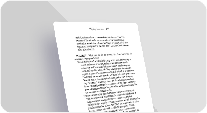 Playboy interview 247 period, to those who are nonassimilable into the new tribe. Not because of his skin color but because he is in a limbo between mechanical and electric cultures, the Negro is a threat, a rival tribe that cannot be digested by the new order. The fate of such tribes is often extermination. PLAYBOY: What can we do to prevent this from happening to America’s Negro population? McLUHAN: I think a valuable first step would be to alert the Negro, as well as the rest of society, to the nature of the new electric technology and the reasons it is so inexorably transforming our social and psychic values. The Negro should understand that the aspects of himself he has been conditioned to think of as inferior or “backward” are actually superior attributes in the new environment. Western man is obsessed by the forward-motion folly of step-by- step “progress,” and always views the discontinuous synaesthetic interrelationships of the tribe as primitive. If the Negro realizes the great advantages of his heritage, he will cease his lemming leap into the senescent mechanical world. There are encouraging signs that the new black-power movement— with its emphasis on Negritude and a return to the tribal pride of African cultural and social roots—is recognizing this, but unfortunately a majority of Negro Americans are still determined to join the mechanical culture. But if they can be persuaded to follow the lead of those who wish to rekindle their sparks of tribal awareness, they will be strategically placed to make an easy transition to the new technology, using their own enduring tribal values as environmental survival aids. They should take pride in these tribal values, for they are rainbowhued in comparison with the pallid literate culture of their traditional masters. But as I said, the Negro arouses hostility in whites precisely because they subliminally recognize that he is closest to that tribal depth involvement and simultaneity and harmony that is the richest and most highly developed expression of human consciousness. This is why the white political and economic institutions mobilize to exclude and oppress Negroes, from semiliterate unions to semiliterate politicians, whose slim visual culture makes them hang on with unremitting fanaticism to their antiquated hardware and the specialized skills and classifications and compartmentalized neighborhoods and life styles deriving from it. The lowest intellectual stratum of whites view literacy and its hardware environment as a novelty, still fresh and still status symbols of achievement, and thus will be the last to retribalize and the first to initiate what could easily become a full-blown racial civil war. The United States as a nation is doomed, in any case, to break up into a