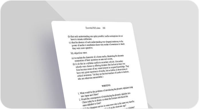 Essential McLuhan 180 (b) that such understanding was quite possible; media assumptions do not have to remain subliminal, (c) that the absence of such understanding was eloquent testimony to the power of media to anesthetize those very modes of awareness in which they were most operative. My objectives were: (a) to explain the character of a dozen media, illustrating the dynamic symmetries of their operation on man and society, (b) to do this in a syllabus usable in secondary schools. (Secondary schools were chosen as offering students who had not in their own lives become aware of any vested interest in acquired knowledge. They have very great experience of media, but no habits of observation or critical awareness. Yet they are the best teachers of media to teachers, who are otherwise unreachable.) WRITING 1. What would be the problems of introducing the phonetic alphabet today into Japan and China? 2. Would the consequences of introducing the phonetic alphabet into China today be as drastic as when the Romans introduced the same.alphabet to Gaul? 3. Will the ideogram survive in some new roles in the same way that the printed book finds new work to do in the electronic age? 4. What are some of the advantages of the ideogram over our alphabet? 5. Does a form of writing which involves complex situations at a single glance favor cultural continuity and stability? 6. By contrast, does a form of writing that favors attention to one-thing-at- a-time foster instability and change? 7. In other words, is the man of the ear a conservative, and the man of the eye a liberal? 8. Why should writing weaken the human memory? Pre-literate man, amazed at the efforts of the white man to write down his thoughts and sayings, asks: “Why do you write; can you not remember?” 9. Why should a pre-literate people have no concept of words as referring to things, but only of words as being things? 10. Is the “content” of writing the medium of speech? Is it possible for any medium to have a content except it be another medium? 11. Is the medium the message? 12. Is is possible for a mathematical proposition or demonstration to have content?