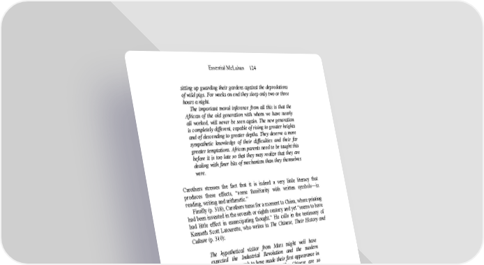 Essential McLuhan 124 sitting up guarding their gardens against the depredations of wild pigs. For weeks on end they sleep only two or three hours a night. The important moral inference from all this is that the African of the old generation with whom we have nearly all worked, will never be seen again. The new generation is completely different, capable of rising to greater heights and of descending to greater depths. They deserve a more sympathetic knowledge of their difficulties and their far greater temptations. African parents need to be taught this before it is too late so that they may realize that they are dealing with finer bits of mechanism than they themselves were. Carothers stresses the fact that it is indeed a very little literacy that produces these effects, “some familiarity with written symbols—in reading, writing and arithmetic.” Finally (p. 318), Carothers turns for a moment to China, where printing had been invented in the seventh or eighth century and yet “seems to have had little effect in emancipating thought.” He calls in the testimony of Kenneth Scott Latourette, who writes in The Chinese, Their History and Culture (p. 310): The hypothetical visitor from Mars might well have expected the Industrial Revolution and the modern scientific approach to have made their first appearance in China rather than the Occident. The Chinese are so industrious, and have shown such ingenuity in invention and by empirical processes have forestalled the West in arriving at so much useful agricultural and medical lore that they, rather than the nations of the West, might have been looked to as the forerunners and leaders in what is termed the scientific approach towards the understanding and mystery of man’s natural environment. It is little short of amazing that a people who pioneered in the invention of paper, printing, gunpowder, and the compass—to speak only of some of their best known innovations—did not also take precedence in devising the power loom, the steam engine, and the other revolutionary machines of the eighteenth and nineteenth centuries. The purpose of printing among the Chinese was not the creation of uniform repeatable products for a market and a price system. Print was an alternative to their prayer-wheels and was a visual means of multiplying incantatory spells, much like advertising in our age.