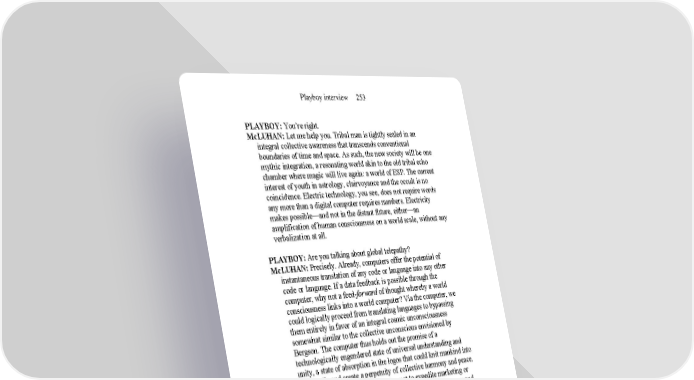 Playboy interview 253 PLAYBOY: You’re right. McLUHAN: Let me help you. Tribal man is tightly sealed in an integral collective awareness that transcends conventional boundaries of time and space. As such, the new society will be one mythic integration, a resonating world akin to the old tribal echo chamber where magic will live again: a world of ESP. The current interest of youth in astrology, clairvoyance and the occult is no coincidence. Electric technology, you see, does not require words any more than a digital computer requires numbers. Electricity makes possible—and not in the distant future, either—an amplification of human consciousness on a world scale, without any verbalization at all. PLAYBOY: Are you talking about global telepathy? McLUHAN: Precisely. Already, computers offer the potential of instantaneous translation of any code or language into any other code or language. If a data feedback is possible through the computer, why not a feed-forward of thought whereby a world consciousness links into a world computer? Via the computer, we could logically proceed from translating languages to bypassing them entirely in favor of an integral cosmic unconsciousness somewhat similar to the collective unconscious envisioned by Bergson. The computer thus holds out the promise of a technologically engendered state of universal understanding and unity, a state of absorption in the logos that could knit mankind into one family and create a perpetuity of collective harmony and peace. This is the real use of the computer, not to expedite marketing or solve technical problems but to speed the process of discovery and orchestrate terrestrial—and eventually galactic—environments and energies. Psychic communal integration, made possible at last by the electronic media, could create the universality of consciousness foreseen by Dante when he predicted that men would continue as no more than broken fragments until they were unified into an inclusive consciousness. In a Christian sense, this is merely a new interpretation of the mystical body of Christ; and Christ, after all, is the ultimate extension of man. PLAYBOY: Isn’t this projection of an electronically induced world consciousness more mystical than technological? McLUHAN: Yes—as mystical as the most advanced theories of modern nuclear physics. Mysticism is just tomorrow’s science dreamed today. PLAYBOY: You said a few minutes ago that all of contemporary man’s traditional values, attitudes and institutions are going to be destroyed and replaced in and by the new electric age. That’s a pretty