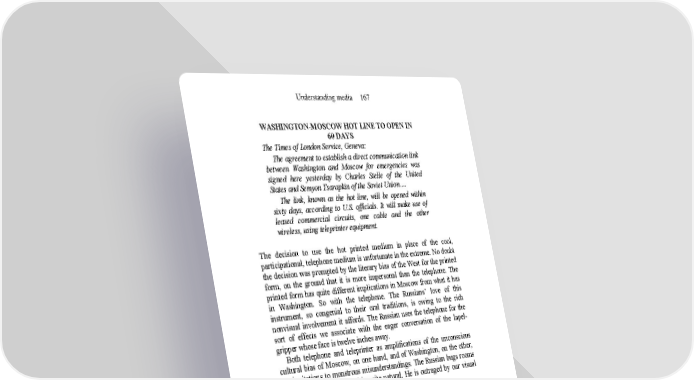 Understanding media 167 WASHINGTON-MOSCOW HOT LINE TO OPEN IN 60 DAYS The Times of London Service, Geneva: The agreement to establish a direct communication link between Washington and Moscow for emergencies was signed here yesterday by Charles Stelle of the United States and Semyon Tsarapkin of the Soviet Union…. The link, known as the hot line, will be opened within sixty days, according to U.S. officials. It will make use of leased commercial circuits, one cable and the other wireless, using teleprinter equipment. The decision to use the hot printed medium in place of the cool, participational, telephone medium is unfortunate in the extreme. No doubt the decision was prompted by the literary bias of the West for the printed form, on the ground that it is more impersonal than the telephone. The printed form has quite different implications in Moscow from what it has in Washington. So with the telephone. The Russians’ love of this instrument, so congenial to their oral traditions, is owing to the rich nonvisual involvement it affords. The Russian uses the telephone for the sort of effects we associate with the eager conversation of the lapel- gripper whose face is twelve inches away. Both telephone and teleprinter as amplifications of the unconscious cultural bias of Moscow, on one hand, and of Washington, on the other, are invitations to monstrous misunderstandings. The Russian bugs rooms and spies by ear, finding this quite natural. He is outraged by our visual spying, however, finding this quite unnatural. The principle that during the stages of their development all things appear under forms opposite to those that they finally present is an ancient doctrine. Interest in the power of things to reverse themselves by evolution is evident in a great diversity of observations, sage and jocular. Alexander Pope wrote Vice is a monster of such frightful mien As to be hated needs but to be seen; But seen too oft, familiar with its face, We first endure, then pity, then embrace. A caterpillar gazing at the butterfly is supposed to have remarked, “Waal, you’ll never catch me in one of those durn things.” At another level we have seen in this century the changeover from the debunking of traditional myths and legends to their reverent study. As we begin to react in depth to the social life and problems of our global village, we become reactionaries. Involvement that goes with our instant