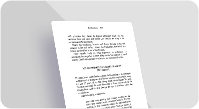 Explorations 193 with principles they attract the highest intellectual ability into the academic field, said Innis, and Roman Law countries are strong in the social sciences for this reason. Always the totalitarian, inclusive and drastic character of the oral tradition in law and society. Always the fragmentary, loop-holed, and limited aspect of law in the written tradition. These remarks imply no value judgements, no preferences. To distinguish the properties of these things avoids the confusion of moral clamor. Clarification permits co-existence, and resolution of conflict. MILTON HAD HIS DAUGHTERS I HAVE MY DICTAPHONE 13 Henry James on his death-bed called for his Remington. It was brought and the sound of its keys soothed his delirium. Dictating to a typist during the last 25 years of his life, Henry James revolutionized his prose. Dictation permitted the slow elaboration of those vast periods of The Golden Bowl. And dictation changed the style of Wyndham Lewis after his blindness. Here is the early, visual Lewis: There are torsos moving with bemused slowness on all sides; their helmet-capped testudinate heads jut this way and that. In their clockwork cadence the exhausted splash of the waves is a sound that is a cold ribbon just existing in the massive heat. The delicate surf falls with the abrupt clash of glass, section by section. After his blindness the prose of Lewis became less pigmented, less kinesthetic. It acquired narrative ease: Pullman had noticed long before this that both giants had kicked off their shoes, which lay, very minute footwear, not far from where their feet were moving. Their clothes had everywhere burst asunder. But it was at this moment that with enormous splutters and gasps,. they suddenly levitated…two vast nudities rose into the air and disappeared over the roofs. But they made their exit buttocks uppermost. Most prominent among American representatives of the oral manner in prose is William Faulkner whose latest novel The Town (volume two) opens: