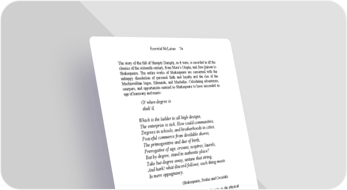 Essential McLuhan 74 The story of the fall of Humpty Dumpty, as it were, is recorded in all the classics of the sixteenth century, from More’s Utopia, and Don Quixote to Shakespeare. The entire works of Shakespeare are concerned with the unhappy dissolution of personal faith and loyalty and the rise of the Machiavellian Iagos, Edmunds, and Macbeths. Calculating adventurers, usurpers, and opportunists seemed to Shakespeare to have succeeded an age of harmony and music: O! when degree is shak’d, Which is the ladder to all high designs, The enterprise is sick. How could communities, Degrees in schools, and brotherhoods in cities, Peaceful commerce from dividable shores, The primogenitive and due of birth, Prerogative of age, crowns, sceptres, laurels, But by degree, stand in authentic place? Take but degree away, untune that string, And hark! what discord follows; each thing meets In mere oppugnancy. (Shakespeare, Troilus and Cressida) The pre-Gutenberg world assumed resonance and music as the physical basis of social order. The shift to individual self-interest and private goals instead of corporate role playing was a sixteenth-century drama that is being played backward today. The return to resonance as the physical basis of being itself is now asserted by science and implemented by instant electric circuitry. The timeless appeal of Prince Hamlet as a chief of state lies in his being torn between his corporate princely role and the new private-power politics of the strong-arm Fortinbras types. “Moreness” went with the divide-and-rule tactics of the new print age of mass production. Machiavelli saw that the uniform repetitive products of the press created the universal market of uniform pricing. He saw that the principle would also extend to ambitious people engaged in specialist activities created by the Gutenberg technology: “Every man has his price.” This was not a cynical observation under the circumstances. Lear’s Dilemma