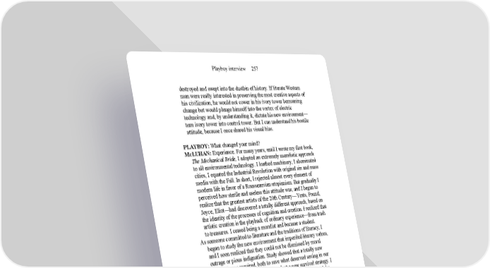 Playboy interview 257 destroyed and swept into the dustbin of history. If literate Western man were really interested in preserving the most creative aspects of his civilization, he would not cower in his ivory tower bemoaning change but would plunge himself into the vortex of electric technology and, by understanding it, dictate his new environment— turn ivory tower into control tower. But I can understand his hostile attitude, because I once shared his visual bias. PLAYBOY: What changed your mind? McLUHAN: Experience. For many years, until I wrote my first book, The Mechanical Bride, I adopted an extremely moralistic approach to all environmental technology. I loathed machinery, I abominated cities, I equated the Industrial Revolution with original sin and mass media with the Fall. In short, I rejected almost every element of modern life in favor of a Rousseauvian utopianism. But gradually I perceived how sterile and useless this attitude was, and I began to realize that the greatest artists of the 20th Century—Yeats, Pound, Joyce, Eliot—had discovered a totally different approach, based on the identity of the processes of cognition and creation. I realized that artistic creation is the playback of ordinary experience—from trash to treasures. I ceased being a moralist and became a student. As someone committed to literature and the traditions of literacy, I began to study the new environment that imperiled literary values, and I soon realized that they could not be dismissed by moral outrage or pious indignation. Study showed that a totally new approach was required, both to save what deserved saving in our Western heritage and to help man adopt a new survival strategy. I adapted some of this new approach in The Mechanical Bride by attempting to immerse myself in the advertising media in order to apprehend their impact on man, but even there some of my old literate “point of view” bias crept in. The book, in any case, appeared just as television was making all its major points irrelevant. I soon realized that recognizing the symptoms of change was not enough; one must understand the cause of change, for without comprehending causes, the social and psychic effects of new technology cannot be counter-acted or modified. But I recognized also that one individual cannot accomplish these self-protective modifications; they must be the collective effort of society, because they affect all of society; the individual is helpless against the pervasiveness of environmental change: the new garbage—or mess- age—induced by new technologies. Only the social organism, united and recognizing the challenge, can move to meet it. Unfortunately, no society in history has ever known enough about the forces that shape and transform it to take action to control and direct new technologies as they extend and transform man. But today,