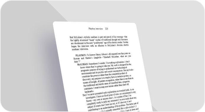 Playboy interview 225 that McLuhan’s stylistic medium is part and parcel of his message—that the tightly structured “linear” modes of traditional thought and discourse are obsolescent in the new “postliterate” age of the electric media. Norden began the interview with an allusion to McLuhan’s favorite electric medium: television. PLAYBOY: To borrow Henry Gibson’s oft-repeated one-line poem on Rowan and Martin’s Laugh-In—“Marshall McLuhan, what are you doin’?” McLUHAN: Sometimes I wonder. I’m making explorations. I don’t know where they’re going to take me. My work is designed for the pragmatic purpose of trying to understand our technological environment and its psychic and social consequences. But my books constitute the process rather than the completed product of discovery; my purpose is to employ facts as tentative probes, as means of insight, of pattern recognition, rather than to use them in the traditional and sterile sense of classified data, categories, containers. I want to map new terrain rather than chart old landmarks. But I’ve never presented such explorations as revealed truth. As an investigator, I have no fixed point of view, no commitment to any theory—my own or anyone else’s. As a matter of fact, I’m completely ready to junk any statement I’ve ever made about any subject if events don’t bear me out, or if I discover it isn’t contributing to an understanding of the problem. The better part of my work on media is actually somewhat like a safe-cracker’s. I don’t know what’s inside; maybe it’s nothing. I just sit down and start to work. I grope, I listen, I test, I accept and discard; I try out different sequences—until the tumblers fall and the doors spring open. PLAYBOY: Isn’t such a methodology somewhat erratic and inconsistent—if not, as your critics would maintain, eccentric? McLUHAN: Any approach to environmental problems must be sufficiently flexible and adaptable to encompass the entire environmental matrix, which is in constant flux. I consider myself a generalist, not a specialist who has staked out a tiny plot of study as his intellectual turf and is oblivious to everything else. Actually, my work is a depth operation, the accepted practice in most modern disciplines from psychiatry to metallurgy and structural analysis. Effective study of the media deals not only with the content of the media but with the media themselves and the total cultural environment within which the media function. Only by standing aside from any phenomenon and taking an overview can you discover its operative principles and lines of force. There’s really nothing inherently startling or radical about this study—except that